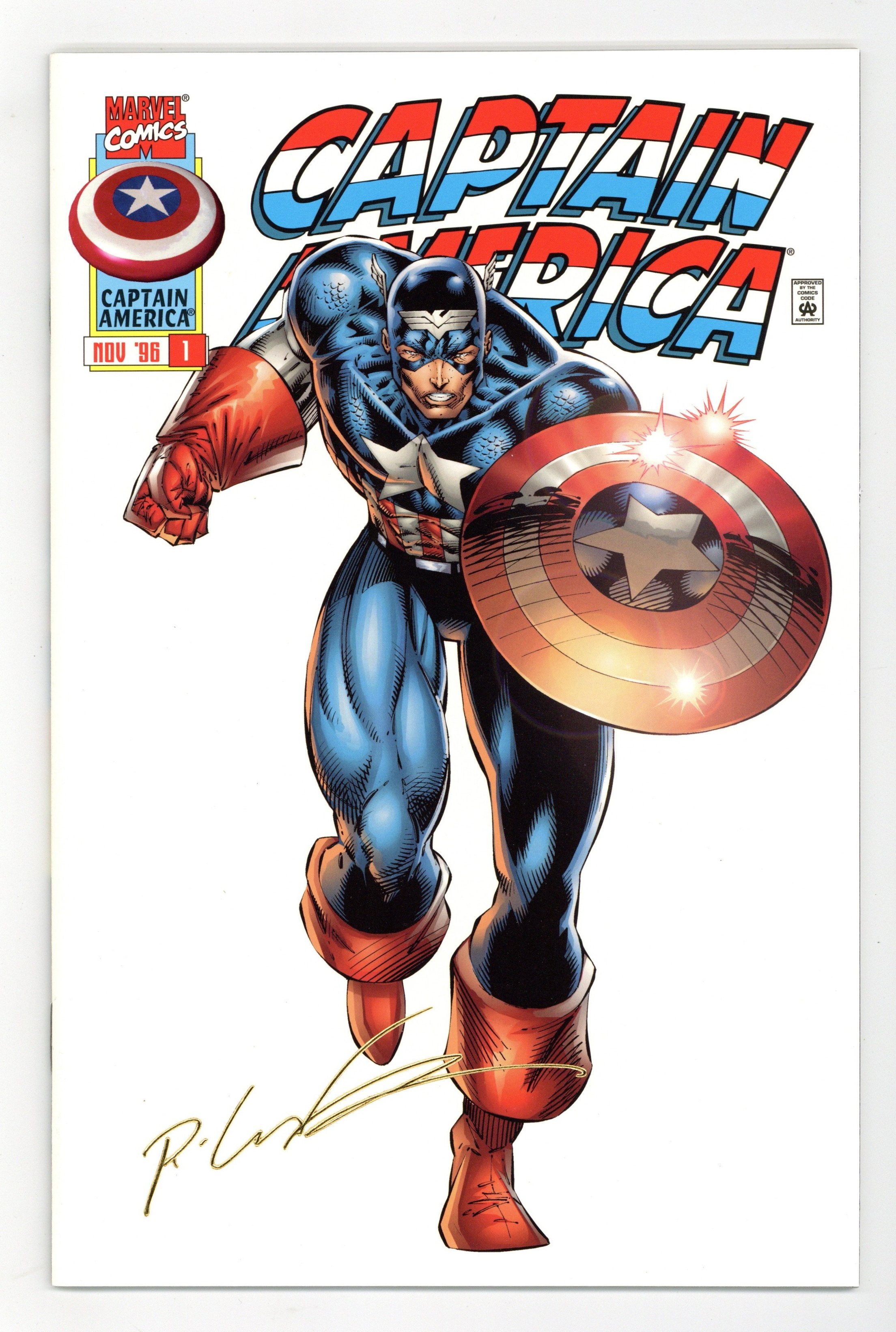 Special limited edition reprint of Captain America (1996-1997 2nd Series) with Rob Liefeld's signature reproduced in 22 Karat Gold with Marvel Comics Certificate of Authenticity. Limited to 2,100 copies. White background cover variant. Rob Liefeld art. 60 pgs.