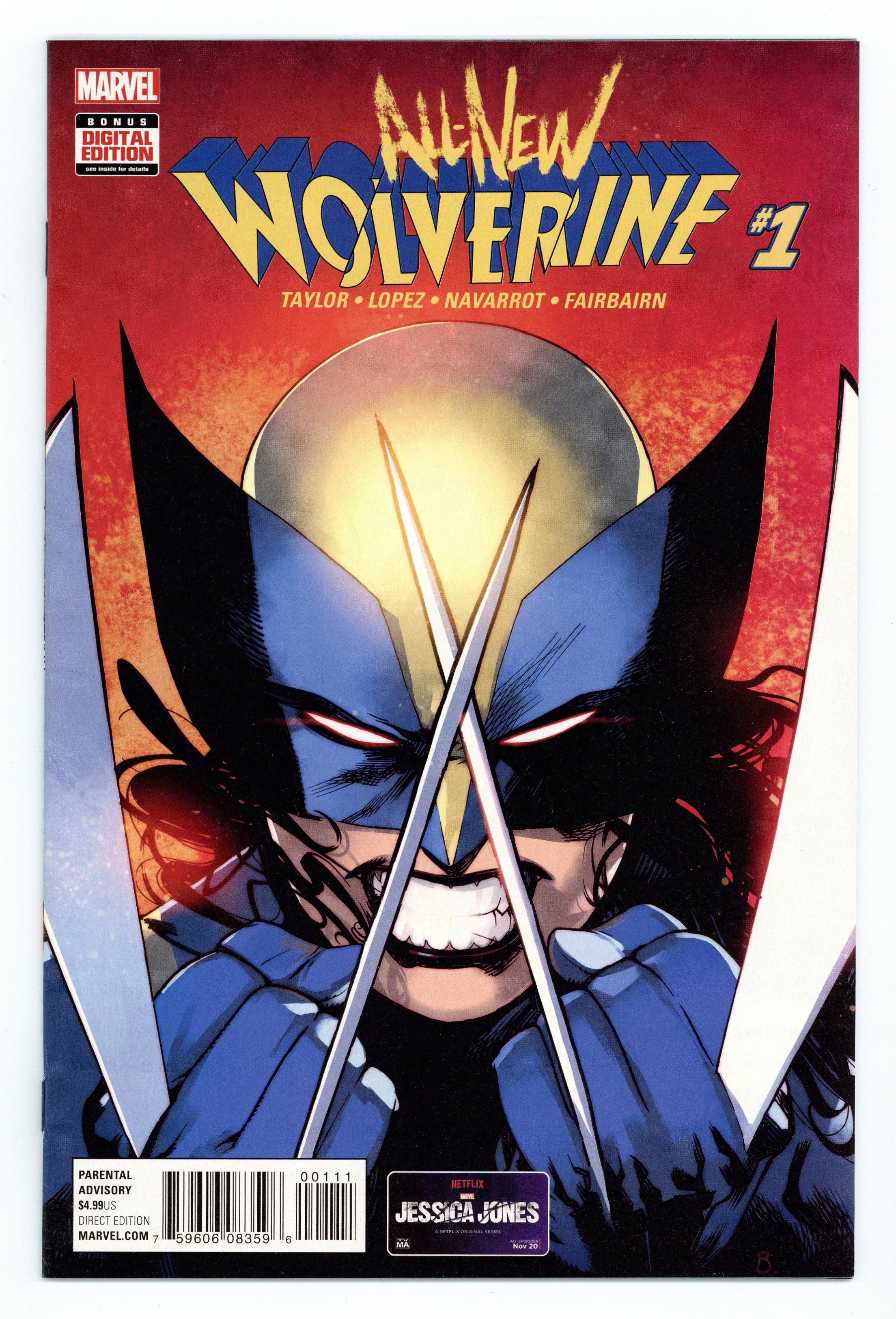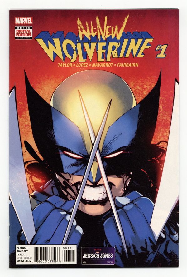 Written by Tom Taylor. Art by David Lopez and David Navarrot. Cover by Bengal. LAURA KINNEY EMBRACES HER DESTINY. HERE! COMES! WOLVERINE! X-23 was created to be a weapon and for a time, that's all she was. But with the help of her mentor, LOGAN-the original WOLVERINE-she escaped that dark past. Tragically, Logan has fallen, but Laura will continue in his footsteps as a hero. Recent events have her doing everything in her power to keep those around her alive, as violent forces are hell-bent on mutual destruction. If anyone can stop them, it's Laura. She is the best there is at what she does. She is THE ALL-NEW WOLVERINE. 44 pages, full color. Parental Advisory Cover price $4.99.