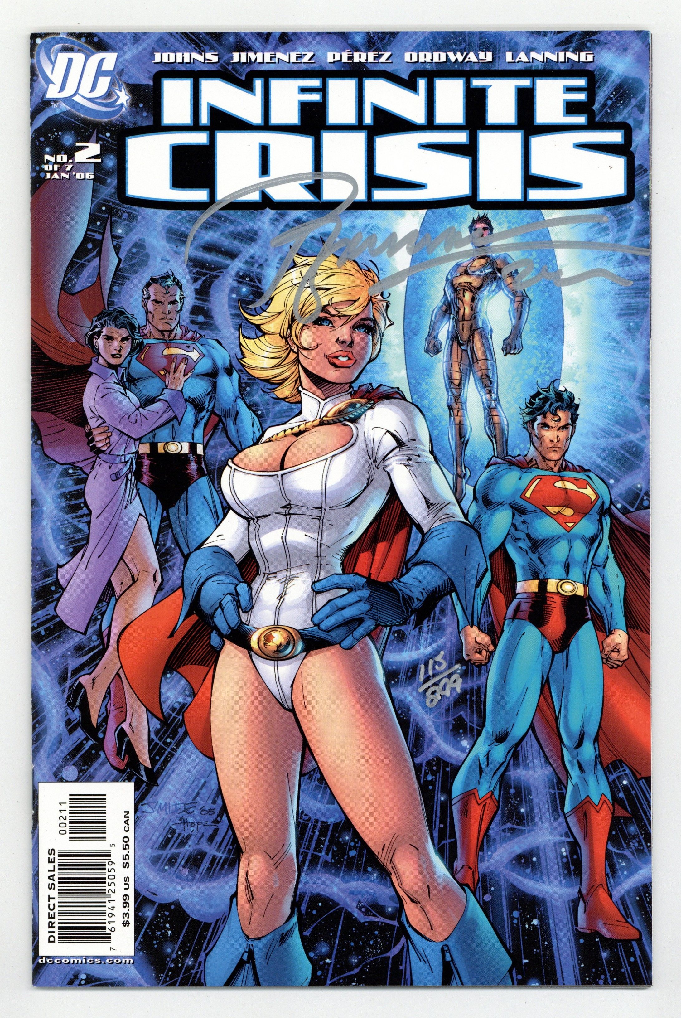 Tags: Infinite Crisis (part 2)$20.00One of 299 copies signed by Phil Jimenez with Dynamic Forces certificate of authenticity. Jim Lee Cover - Written by Geoff Johns Art by Phil Jimenez & Andy Lanning Covers by Jim Lee & Sandra Hope and George Pérez. The biggest comics event of the year is just getting started! The heroes are divided as chaos erupts across the world and the universe ? from Paradise Island to the farthest reaches of space. But what strange new force prepares to help? And, more important, why? Plus, a time-lost hero returns in search of an object that will turn the tide of one of the many wars. Guest-starring Supergirl, Alan Scott, Metamorpho, Animal Man, Firestorm, Power Girl and dozens of others! Retailers please note: This issue will ship with covers by Lee & Hope (50%) and Pérez (50%). On sale November 9 ? 2 of 7 ? 40 pg, FC, $3.99 US