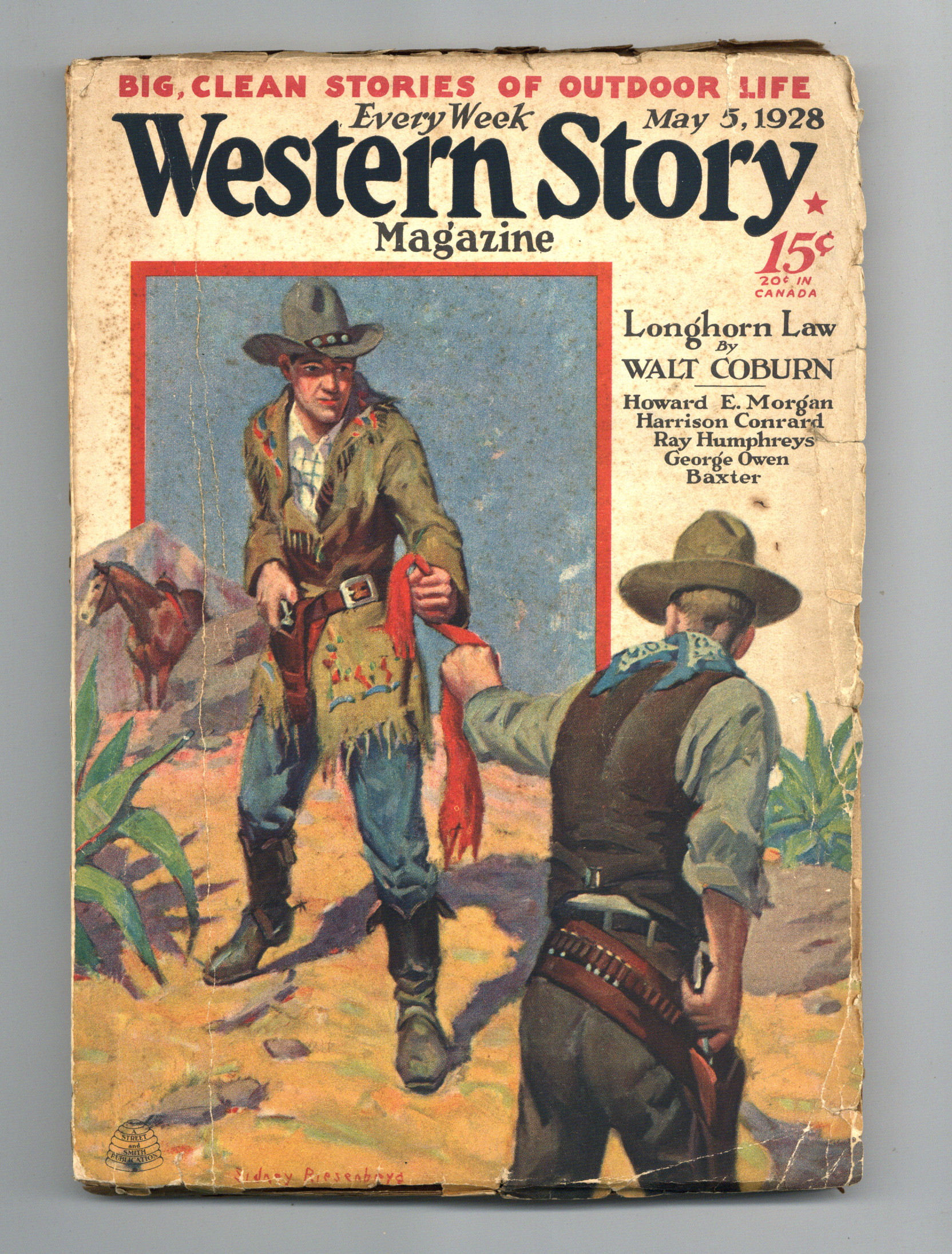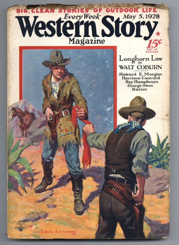 Volume 77, Issue 6 - May 1928. Cover by Sidney Riesenberg. Features "Longhorn Law" by Walt Coburn. Other stories by Howard E. Morgan, Harrison Conrad, Ray Humphreys, and George Owen Baxter. 7-in. x 10-in., 152 pages, Text only (with B&W illustrations) Cover price $0.15.