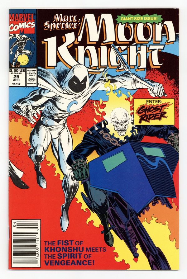Ghosts of the Past - Written by Howard Mackie. Art by Mark Bagley & Tom Palmer. Ghost Rider guest-stars in a double-sized milestone issue! Flame head helps Moon Knight when the Knights of the Moon challenge Marc Spector's right to serve as a warrior of Khonshu! And if that isn't enough, Plasma attacks, too! 48 pages, full color. Cover price $2.50.