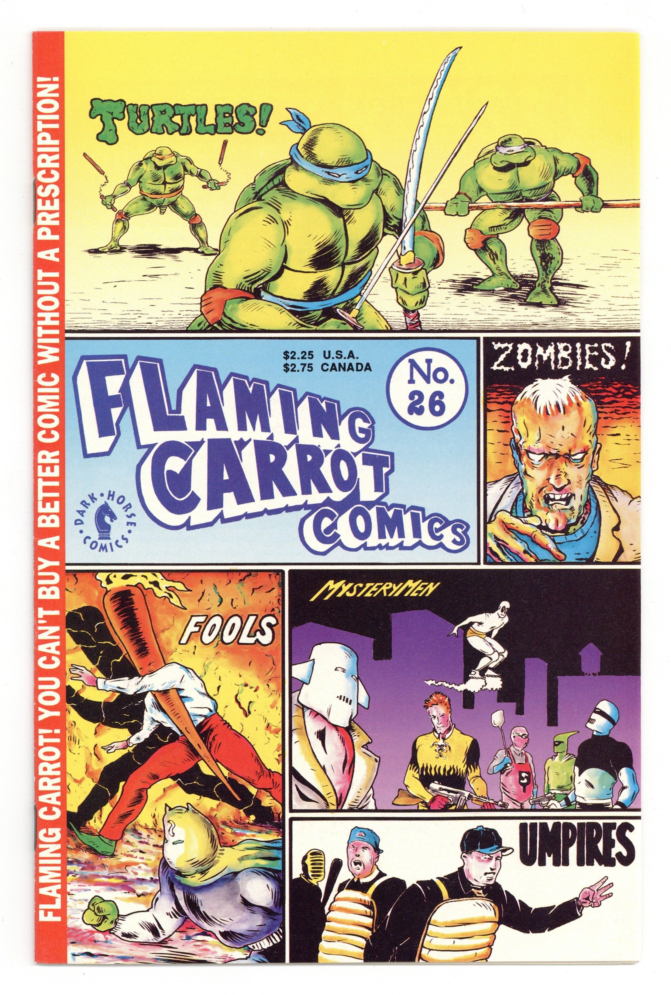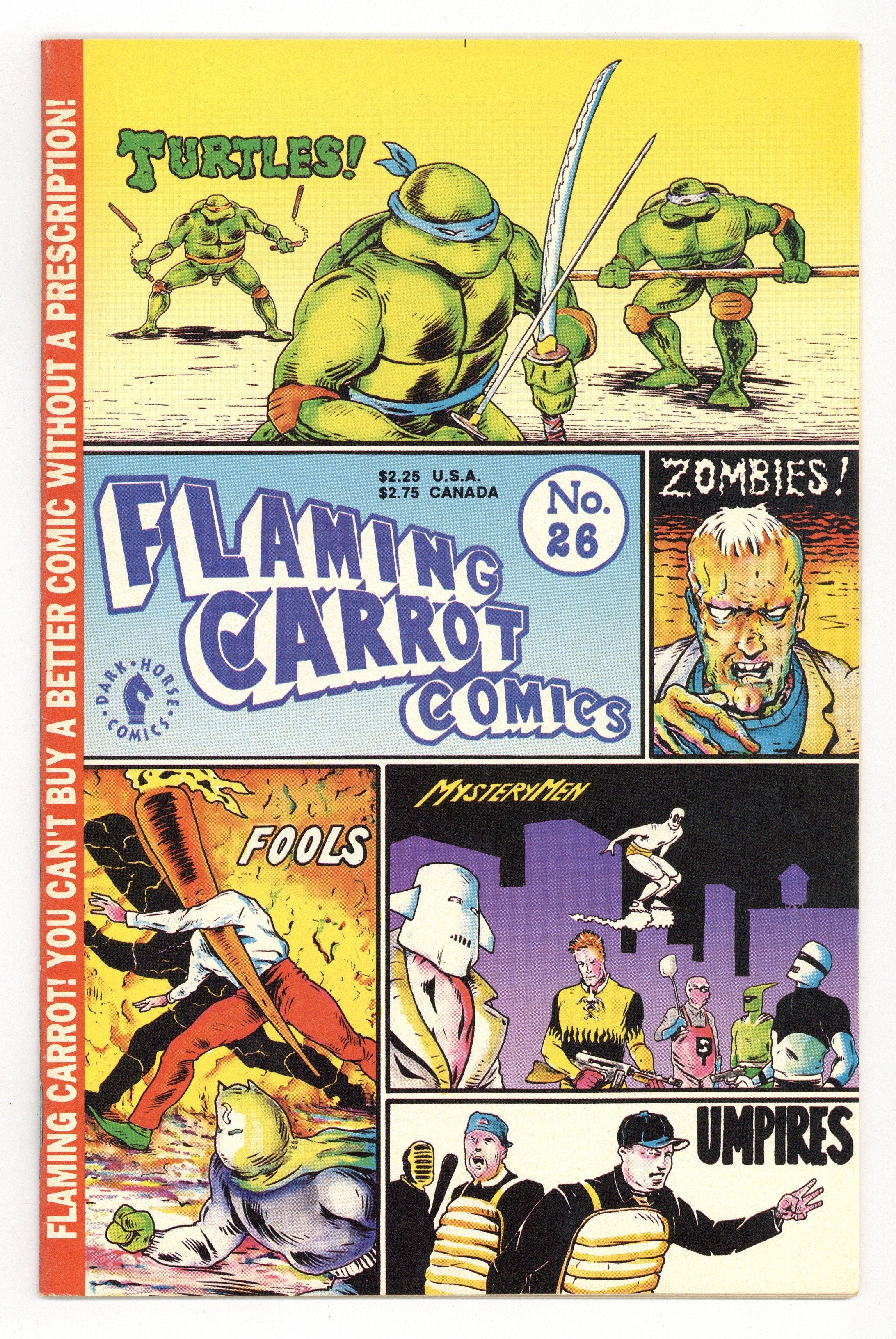 Published Jun 1991 by AV/Dark Horse.$18.00Flaming Carrot/TMNT Crossover: Part 1 -of 3 - Story and art by Bob Burden. Guest-starring the Teenage Mutant Ninja Turtles. Featuring Ninja Turtles, Zombies, super heroes, and Umpires! What!? Umpires?! 32 pages, B&W. Cover price $2.25.