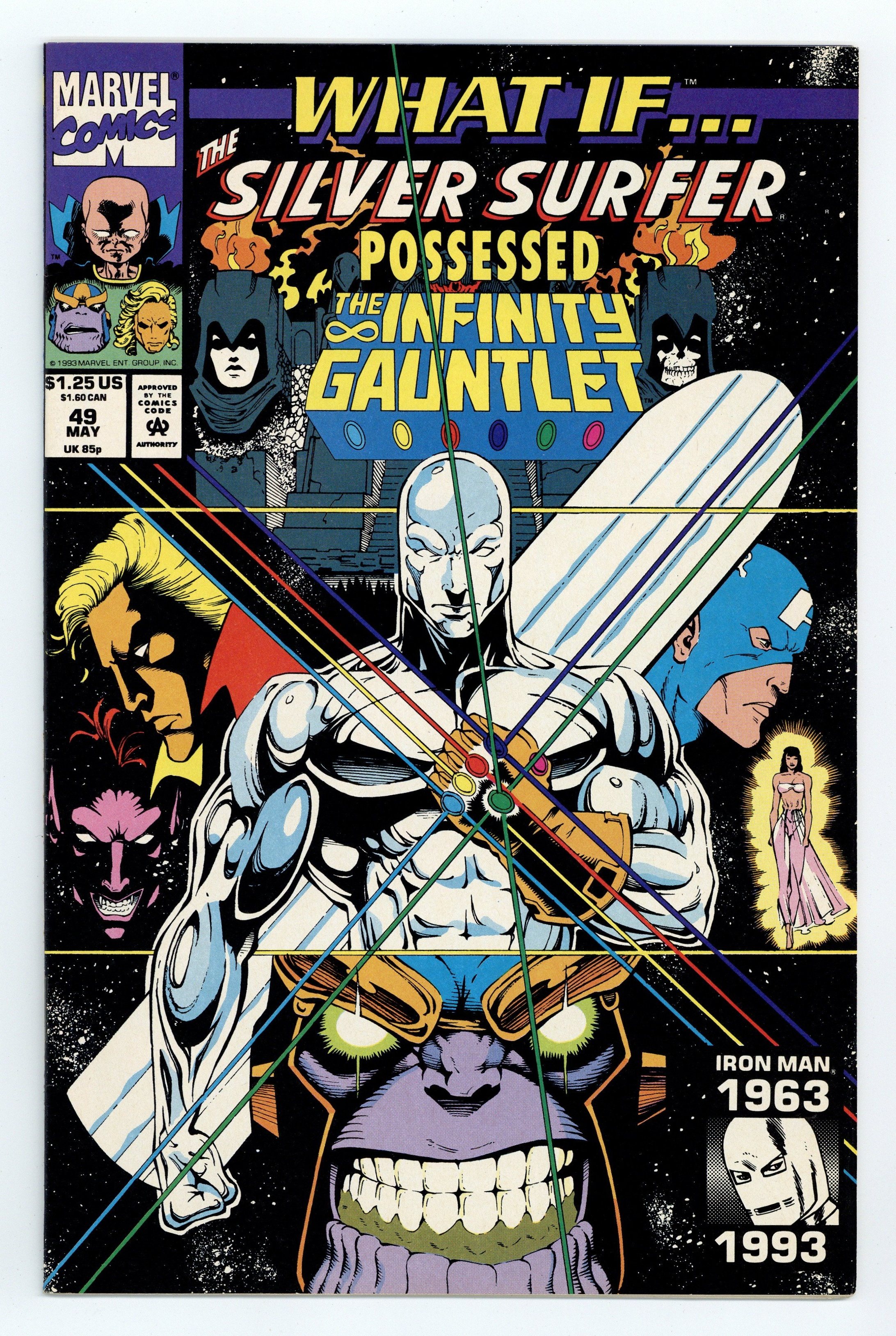 "What If the Silver Surfer Possessed the Infinity Gauntlet?" Script by Ron Marz, pencils by Scott Clark (with Kevin West), inks by Pamela Eklund. Guest starring Thanos and Adam Warlock. Appearances by Captain America, Mephisto, Doctor Strange, and Shalla-Bal. Cameos by Galactus, Wolverine, Cyclops, the Hulk, the Scarlet Witch, the Sub-Mariner, She-Hulk, Eros, the Vision, Cloak, Firelord, Drax the Destroyer, Thor, Nova, Quasar, Iron Man, Spider-Man, Doctor Doom, Nebula, Terraxia, and Captain Marvel. Cover price $1.25.