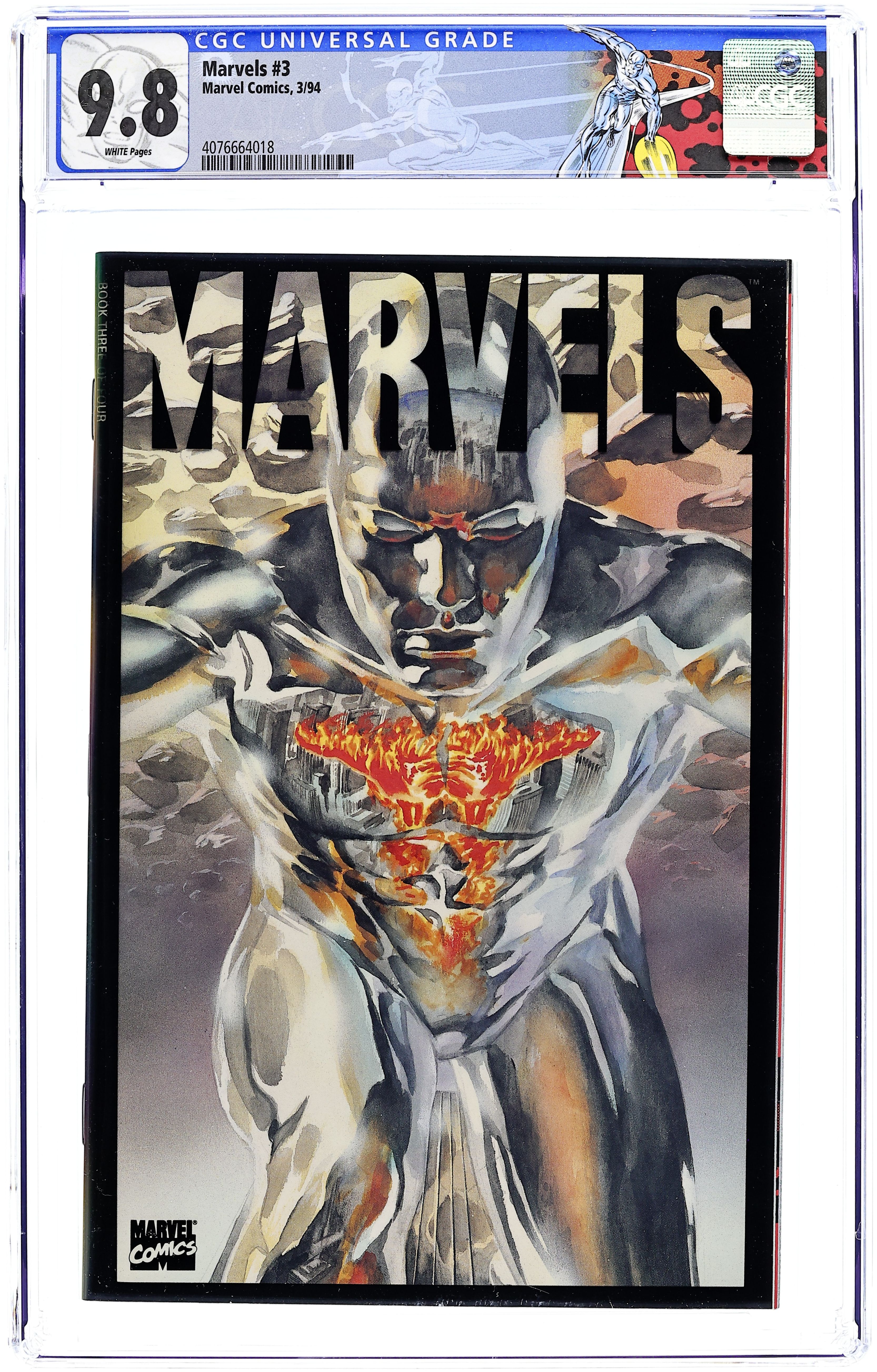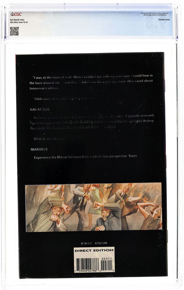 Steeped in unprecedented realism, this groundbreaking series tells the tale of the classic Marvel Universe as seen through the eyes of photojournalist Phil Sheldon. Book three chronicles the coming of Galactus and the Silver Surfer. Written by Kurt Busiek, with painted art by Alex Ross. This is the 1st printing and has an acetate (plastic) outer cover. The 2nd printing does not have an acetate cover. Cover price $5.95.