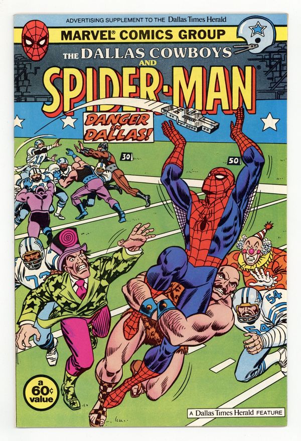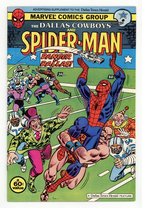 Dallas Times Herald giveaway featuring the Dallas Cowboys. Cover art by John Romita. "Danger in Dallas!", script by Marie Severin and David Kraft, pencils by Marie Severin and Kerry Gammill, inks by Mike Esposito; Spider-Man vs. Ringmaster and his Circus of Crime. "Touchdown Maze!" activity page. "The Origin of Spider-Man!" one-page story. "Find the Amazing Spider-Man's Shadow!" activity. "Be a Spider-Man Artist!" activity page. 36 pgs., full color.