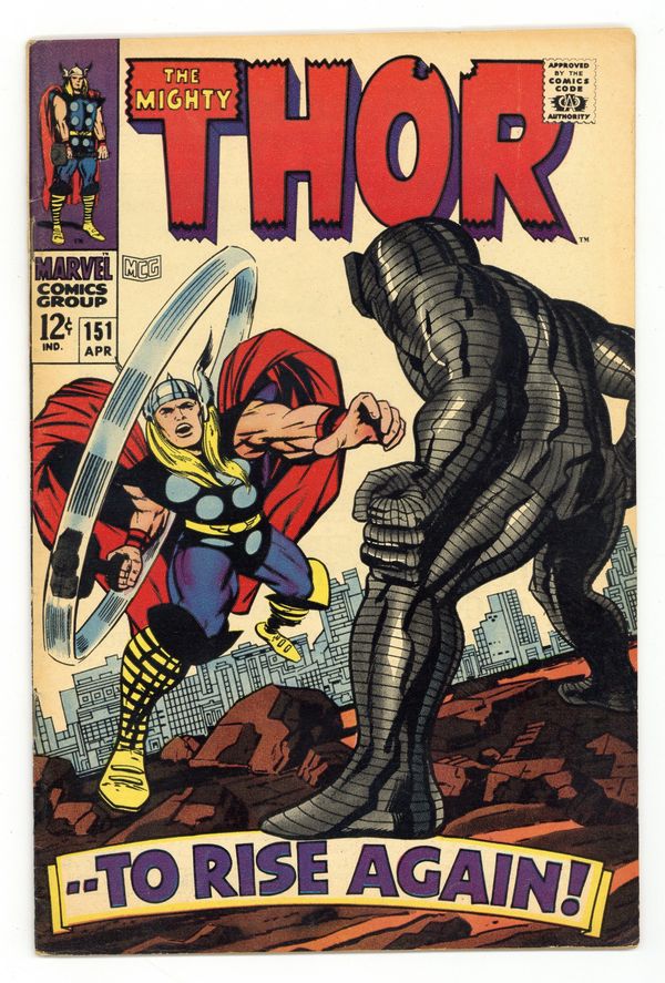 Tags: Marvel Legacy Numbering: Thor (part 151), Thor$20.50Cover pencils by Jack Kirby, inks by Vince Colletta. "To Rise Again!", script by Stan Lee, pencils by Jack Kirby, inks by Vince Colletta; Thor battles the Destroyer to a standstill, not knowing that it is Sif's life force that animates the creature; Odin decides that Thor has been punished long enough and restores his full power; Meanwhile, Ulik and a Troll army attack Karnilla's castle, and she releases Balder from her thrall so that he can fight for her. "Origins of the Inhumans" back-up: "Inhumans at Large!", script by Stan Lee, pencils by Jack Kirby, inks by Joe Sinnott; Triton origin continued; Triton escapes from the humans who captured him. 36 pgs., full color. Cover price $0.12.