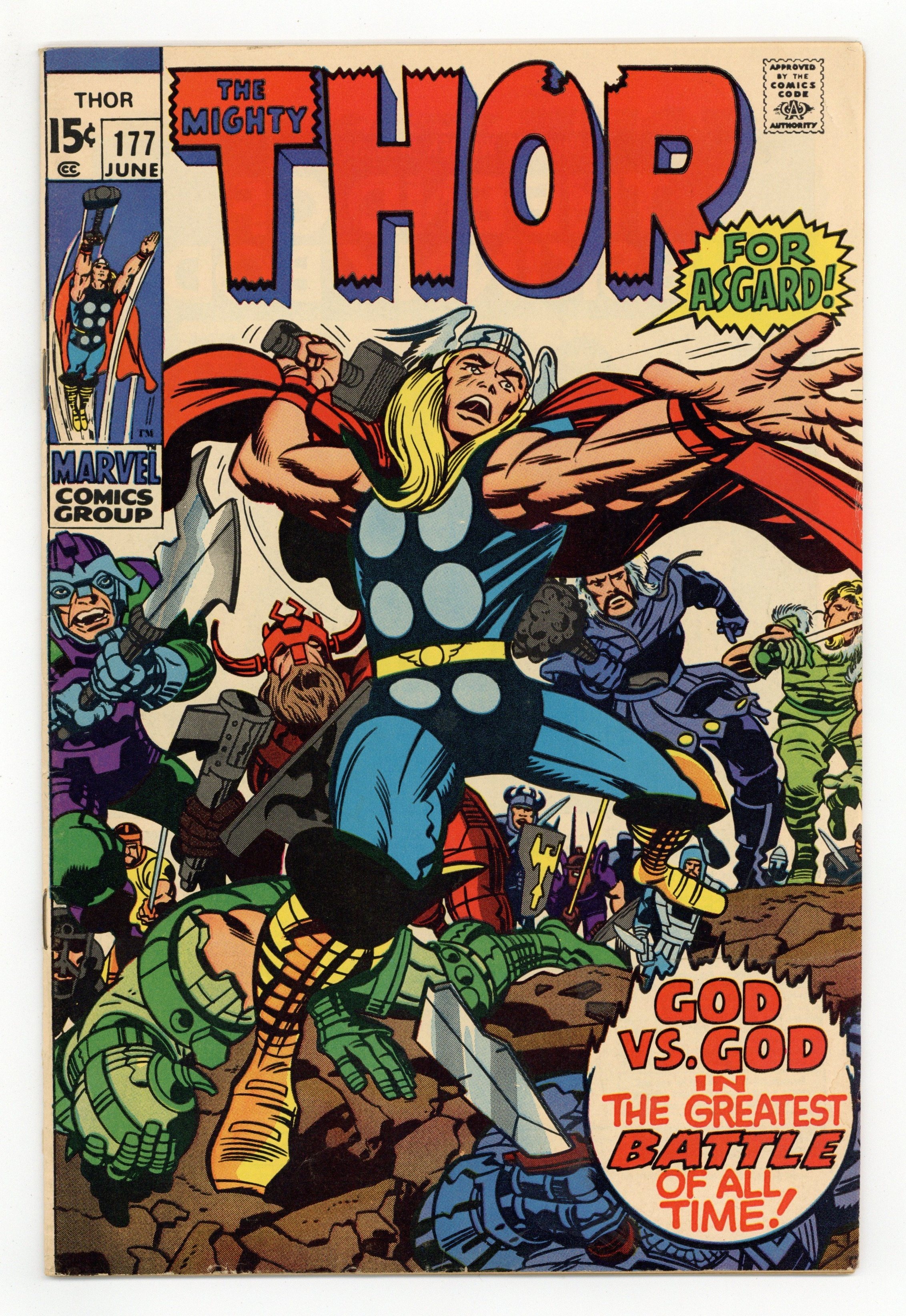 Cover pencils by Jack Kirby, inks by John Verpoorten. "To End in Flames!", script by Stan Lee, pencils by Jack Kirby, inks by Vince Colletta; While seeking to escape the destruction of Asgard at the hands of Surtur, Loki and one of his followers escape to Earth, however they find that Surtur's coming has also caused environmental upheaval on Earth itself, leaving Loki to hope that his hated half-brother finds some way to defeat Surtur; While back in Asgard, the royal city has been set ablaze by the coming of Surtur, prompting Thor to gather an army of warriors to fight against the fire demon. Appearances by Balder, Karnilla, Fandral, Volstagg, and Hogun. Letter to the editor from comics artist Alan Kupperberg. 36 pgs., full color. $0.15. Cover price $0.15.