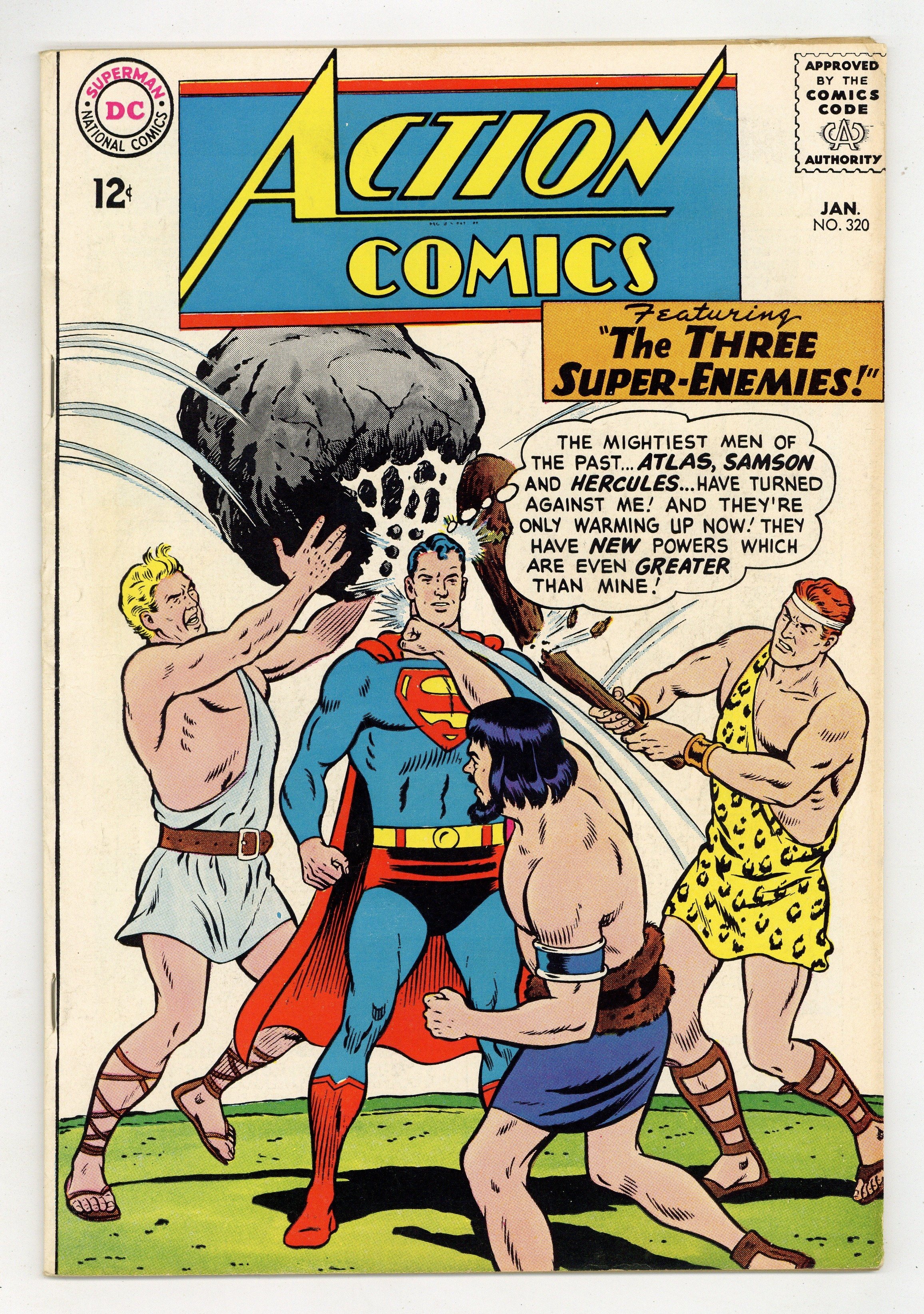 Tags: Superman$29.00Cover pencils by Curt Swan, inks by George Klein. Samson, Atlas, and Hercules gang up on Superman in "The Three Super-Enemies!", script by Otto Binder, art by Curt Swan (splash) and Al Plastino; To protect his secret identity, Superman is forced to call three heroes from the past to stop a gang of criminals menacing Metropolis, but he accidentally draws them from a parallel world where the heroes are really villains. "The Man Who Broke Supergirl's Heart," script by Leo Dorfman, art by Jim Mooney; Interplanetary criminals Bronar and Skoll create an android whose mission is to make Supergirl fall in love with him so that he can lure her into a trap where her super-powers will be stolen. 80 Page Giant Superman Annual ad. John F. Kennedy is featured in a one-page public service announcement, "Salute to Courage." 36 Pages, Full Color. $0.12 Cover price $0.12.