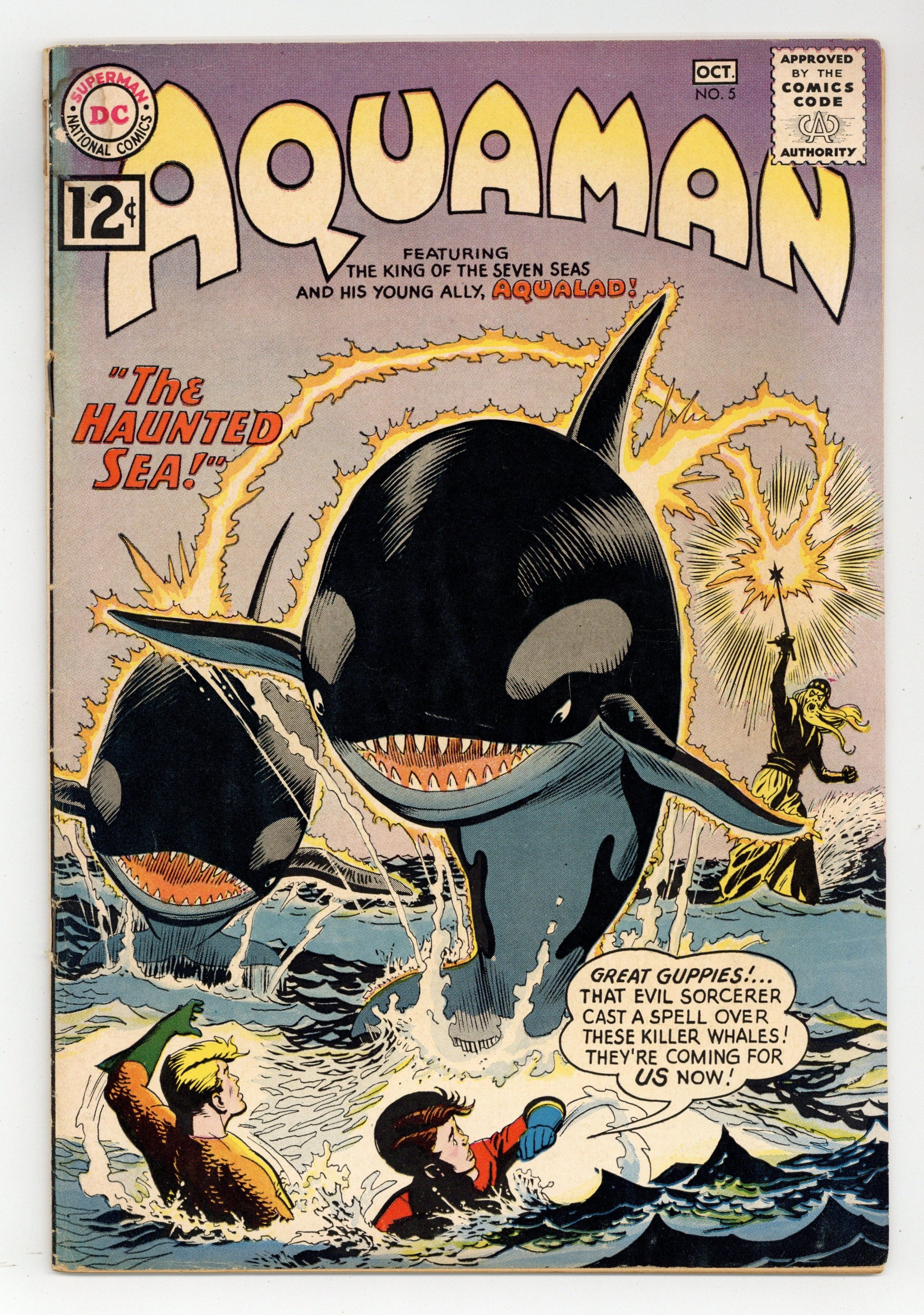 Cover art by Nick Cardy. The Haunted Sea, art by Nick Cardy; Aquaman and Aqualad accidentally free an evil sorcerer from the drop of water he and his henchmen were imprisoned in. Pioneers Under the Sea article. 36 pgs. $0.12. Cover price $0.12.