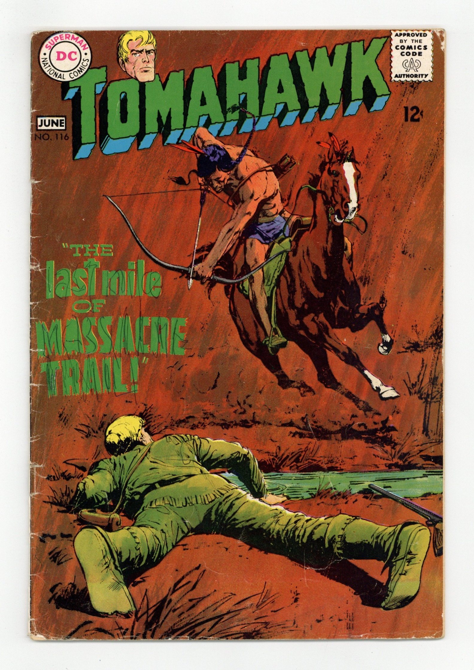 Cover pencils by Neal Adams, inks by Jack Adler. The Last Mile of Massacre Trail! starring Tomahawk, script by Carl Wessler, art by Fred Ray. The Making of a Hero starring Tomahawk, script by Carl Wessler, art by Fred Ray. 36 Pages, Full Color. Cover price $0.12.