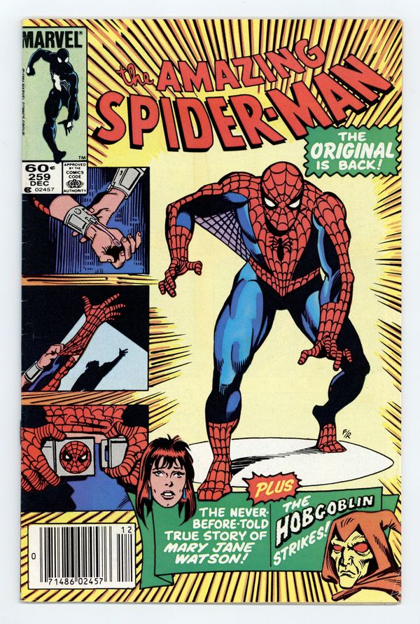 Tags: Mark Jeweler Edition, Spider-Man$17.50Mark Jeweler Advertisement Insert Variant. "All My Pasts Remembered!" Script by Tom DeFalco. Pencils by Ron Frenz. Inks by Joe Rubinstein. Cover by Ron Frenz and Joe Rubinstein. After Mary Jane's bombshell revelation to Peter two issues ago, the pair of long-time friends takes a walk together through Central Park. MJ shares her family history with Peter...to make him comfortable with her knowing his secret identity. Where will their relationship go from here? Meanwhile, the Hobgoblin is back in business! And attempting to cut into the Kingpin's action (with help from his new ally: the Rose)! Origin of Mary Jane Watson. Cameo appearances by Mr. Fantastic, She-Hulk, and the alien symbiote. Flashback cameos by Aunt May and Anna Watson. (Notes. The Amazing Spider-Man returns to his original red and blue costume. This issue was reprinted in Marvel Tales 273.) Cover price $0.60.
