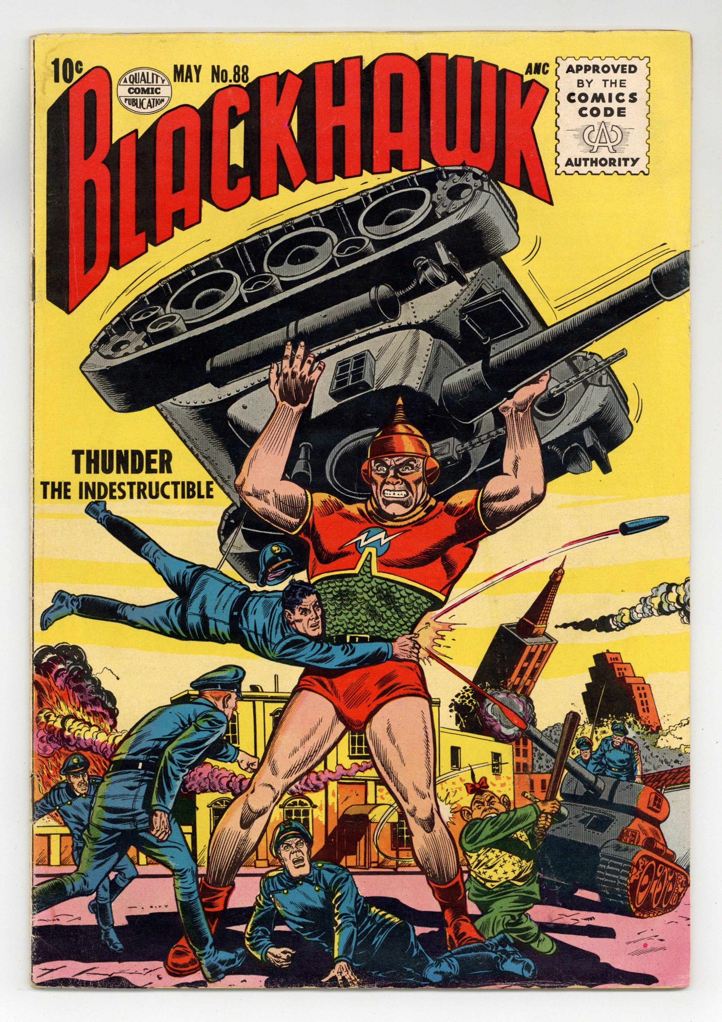 Cover by Dick Dillin and Chuck Cuidera. Stories by Dick Wood, Paul Gustavson and unknown. Art by Dick Dillin, Paul Gustavson and Chuck Cuidera. Featuring Blackhawk in: "Thunder, the Indestructible" by Dick Wood, Dick Dillin and Chuck Cuidera; "The Incredible Silencer" by Wood, Dillin and Cuidera; and "The Phantom Sniper" by Wood, Dillin and Cuidera. Plus: Chop Chop in an untitled back-up story by Paul Gustavson, reprinted from issue #59. And: 1-page text story "The Isle of No Return," reprinted from issue #46. 36 Pages, Full Color. Cover price $0.10.