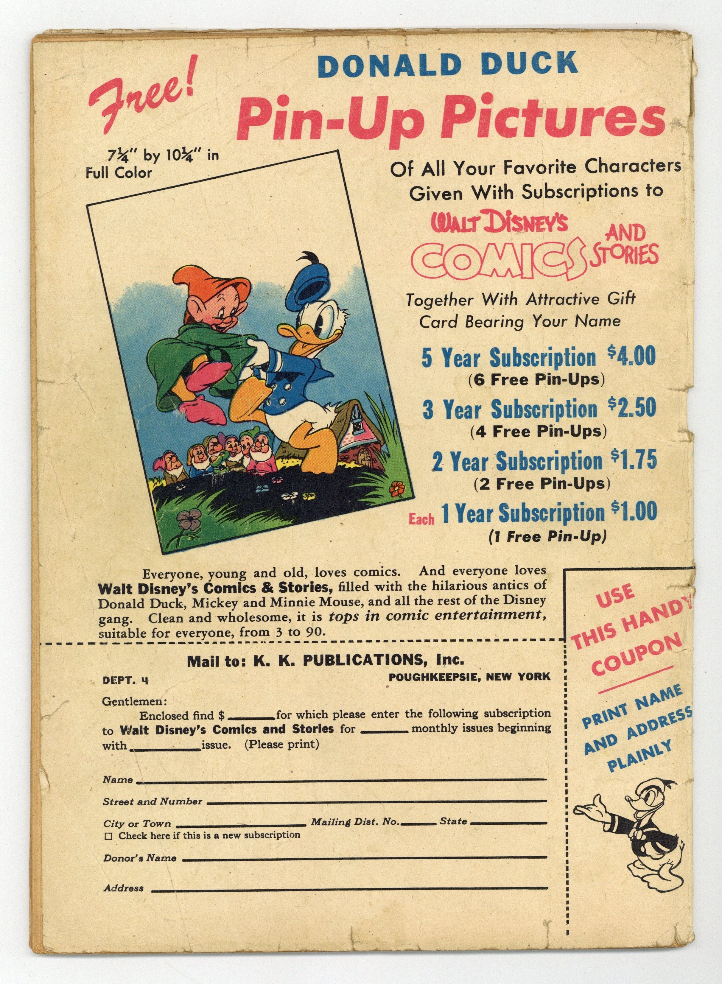 Stories and art by Carl Barks, Floyd Gottfredson, Bill Walsh, Dick Moores, Bob Karp, Hubie Karp, Paul Murry, George Waiss, Bill Wright, Sylvia Holland, and Al Taliaferro. Sometimes listed as Vol. 7 #7. The long-running vehicle for Disney character comics featured work by Carl Barks, Floyd Gottfredson, and Pogo's Walt Kelly. In a classic story from the Mickey Mouse comic strip, the ghost ship seemingly sends Mickey back in time, where pirate Captain Greatbeard looks exactly like Peg Leg Pete. In a story by Barks, Donald refuses to take his nephews along on a picnic with Daisy, so they sabotage the picnic. Huey, Dewey and Louie seek a good cover story after they eat the candy that Donald got for Daisy. Donald Duck; Bucky Bug; Li'l Bad Wolf; Mickey Mouse; Figaro and Frankie; Goofy; The Lion's Crown; Grandma Duck; Mickey Mouse: The Isle of Death. 48 pages, Full Color. Cover price $0.10.