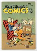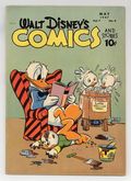 Tags: Disney Ducks & MicePublished May 1947 by Dell/Gold Key.$28.00Stories and art by Carl Barks, Floyd Gottfredson, Bill Walsh, Dick Moores, Bob Karp, Hubie Karp, Paul Murry, George Waiss, Bill Wright, Sylvia Holland, and Al Taliaferro. Sometimes listed as Vol. 7 #8. The long-running vehicle for Disney character comics featured work by Carl Barks, Floyd Gottfredson, and Pogo's Walt Kelly. In a classic story from the Mickey Mouse comic strip, the ghost ship seemingly sends Mickey back in time, where pirate Captain Greatbeard looks exactly like Peg Leg Pete. In a story by Barks, Donald tries to get his nephews out of the yard so he can plant a prize-winning flower garden. A bizarre bird keeps ruining Donald's nature photos. Donald Duck; Bucky Bug; Li'l Bad Wolf; Mickey Mouse; Clown of the Jungle; Minnie's Mix-Up; Donald's Dilemma; Mickey Mouse: The Isle of Death. 48 pages, Full Color. Cover price $0.10.