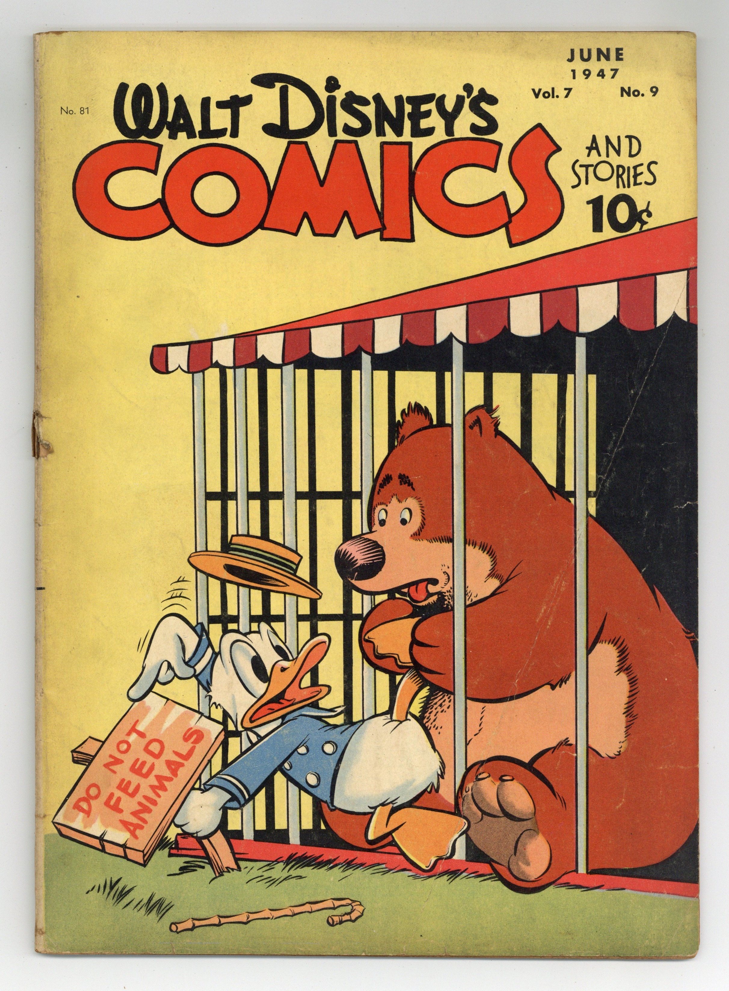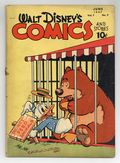 Stories and art by Carl Barks, Floyd Gottfredson, Merrill De Maris, Bob Karp, Hubie Karp, Ralph Heimdahl, Paul Murry, George Waiss, Bill Wright, Sylvia Holland, and Al Taliaferro. Sometimes listed as Vol. 7 #9. The long-running vehicle for Disney character comics featured work by Carl Barks, Floyd Gottfredson, and Pogo's Walt Kelly. In a classic story from the Mickey Mouse comic strip, Mickey matches wits with a mesmerist who uses his act for jewel theft. In a story by Barks, Donald mistakes his nephews' fake treasure map for the real thing. Li'l Bad Wolf explores a haunted mine and finds a bear. Donald Duck; Bucky Bug; Li'l Bad Wolf; Mickey Mouse; Crazy with the Heat; The May Baskets; Donald's Dilemma; Mickey Mouse: The Jewel Robbery. 48 pages, Full Color. Cover price $0.10.
