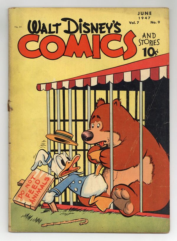 Tags: Disney Ducks & MicePublished Jun 1947 by Dell/Gold Key.$40.00Stories and art by Carl Barks, Floyd Gottfredson, Merrill De Maris, Bob Karp, Hubie Karp, Ralph Heimdahl, Paul Murry, George Waiss, Bill Wright, Sylvia Holland, and Al Taliaferro. Sometimes listed as Vol. 7 #9. The long-running vehicle for Disney character comics featured work by Carl Barks, Floyd Gottfredson, and Pogo's Walt Kelly. In a classic story from the Mickey Mouse comic strip, Mickey matches wits with a mesmerist who uses his act for jewel theft. In a story by Barks, Donald mistakes his nephews' fake treasure map for the real thing. Li'l Bad Wolf explores a haunted mine and finds a bear. Donald Duck; Bucky Bug; Li'l Bad Wolf; Mickey Mouse; Crazy with the Heat; The May Baskets; Donald's Dilemma; Mickey Mouse: The Jewel Robbery. 48 pages, Full Color. Cover price $0.10.