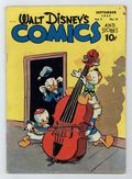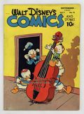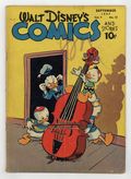 Tags: Disney Ducks & MicePublished Sep 1947 by Dell/Gold Key.$40.00Cover by Walt Kelly. Stories and art by Carl Barks, Floyd Gottfredson, Merrill De Maris, Dick Moores, Bob Karp, Hubie Karp, Ralph Heimdahl, Paul Murry, Chase Craig, Gil Turner, Don Gunn, George Waiss, Bill Wright, Sylvia Holland, and Al Taliaferro. Sometimes listed as Vol. 7 #12. The long-running vehicle for Disney character comics featured work by Carl Barks, Floyd Gottfredson, and Pogo's Walt Kelly. In a classic story from the Mickey Mouse comic strip, Mickey matches wits with a mesmerist who uses his act for jewel theft. In a story by Barks, hep dancer Donald tries to learn to waltz, so he and Daisy can enter a waltz contest. Huey, Dewey and Louie are nervous about the coming visit of a cousin nicknamed Sock. Donald Duck; Bucky Bug; Li'l Bad Wolf; Mickey Mouse; Vacation Voyage; Mickey's Delayed Date; Mickey Mouse: The Jewel Robbery. 48 pages, Full Color. Cover price $0.10.