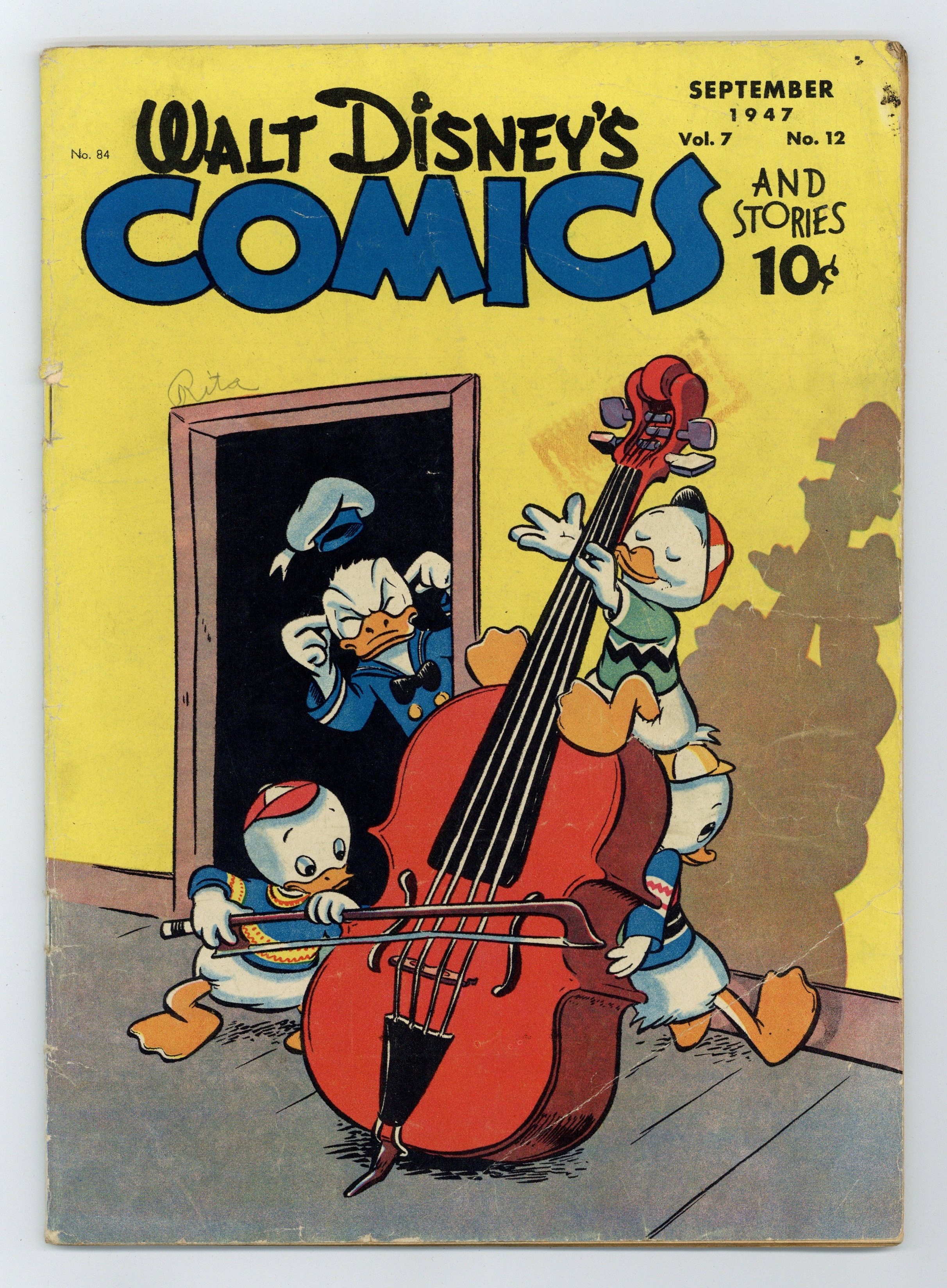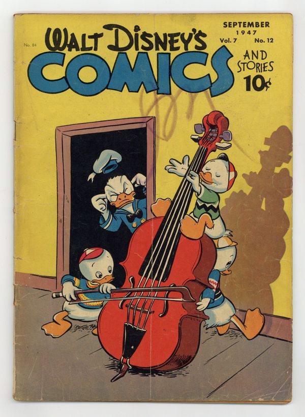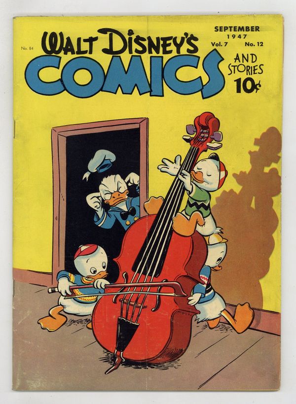 Tags: Disney Ducks & MicePublished Sep 1947 by Dell/Gold Key.$20.00Cover by Walt Kelly. Stories and art by Carl Barks, Floyd Gottfredson, Merrill De Maris, Dick Moores, Bob Karp, Hubie Karp, Ralph Heimdahl, Paul Murry, Chase Craig, Gil Turner, Don Gunn, George Waiss, Bill Wright, Sylvia Holland, and Al Taliaferro. Sometimes listed as Vol. 7 #12. The long-running vehicle for Disney character comics featured work by Carl Barks, Floyd Gottfredson, and Pogo's Walt Kelly. In a classic story from the Mickey Mouse comic strip, Mickey matches wits with a mesmerist who uses his act for jewel theft. In a story by Barks, hep dancer Donald tries to learn to waltz, so he and Daisy can enter a waltz contest. Huey, Dewey and Louie are nervous about the coming visit of a cousin nicknamed Sock. Donald Duck; Bucky Bug; Li'l Bad Wolf; Mickey Mouse; Vacation Voyage; Mickey's Delayed Date; Mickey Mouse: The Jewel Robbery. 48 pages, Full Color. Cover price $0.10.