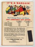 Cover by Walt Kelly. Stories and art by Carl Barks, Floyd Gottfredson, Merrill De Maris, Dick Moores, Bob Karp, Dick Shaw, Ralph Heimdahl, Gil Turner, Don Gunn, George Waiss, Bill Wright, Sylvia Holland, and Al Taliaferro. Sometimes listed as Vol. 8 #4. The long-running vehicle for Disney character comics featured work by Carl Barks, Floyd Gottfredson, and Pogo's Walt Kelly. In a classic story from the Mickey Mouse comic strip, Goofy acquires a pet lion named Agnes. In the very first Gladstone Gander story, Donald makes a bet with Gladstone and must go swimming in Frozenbear Lake on Christmas Day. Li'l Bad Wolf plays Santa to a homeless porcupine. Donald Duck; Bucky Bug; Li'l Bad Wolf; Mickey Mouse; Santa's Surprise; They're Off; Mickey Mouse: Goofy and Agnes. 48 pages, Full Color. Cover price $0.10.