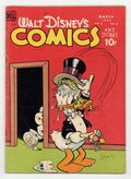 Tags: Disney Ducks & MicePublished Mar 1948 by Dell/Gold Key.$40.00Cover by Walt Kelly. Stories and art by Carl Barks, Floyd Gottfredson, Merrill De Maris, Dick Moores, Bob Karp, Dick Shaw, Ralph Heimdahl, Don Gunn, George Waiss, Bill Wright, Sylvia Holland, and Al Taliaferro. Sometimes listed as Vol. 8 #6. The long-running vehicle for Disney character comics featured work by Carl Barks, Floyd Gottfredson, and Pogo's Walt Kelly. In a classic story from the Mickey Mouse comic strip, Goofy acquires a pet lion named Agnes. In a story by Barks, Donald competes with his nephews when they get jobs as telegram messengers. Bucky Bug battles a squirrel. Donald Duck; Bucky Bug; Li'l Bad Wolf; Mickey Mouse; Have a Heart; Daddy Duck; Pluto: The Bone Bandit; Mickey Mouse: Goofy and Agnes. 48 pages, Full Color. Cover price $0.10.