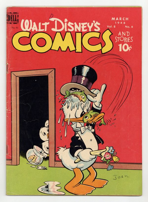 Tags: Disney Ducks & MicePublished Mar 1948 by Dell/Gold Key.$14.00- 4" cumulative spine split. Centerfold detached at one staple. Cover oxidation. Water damage.
