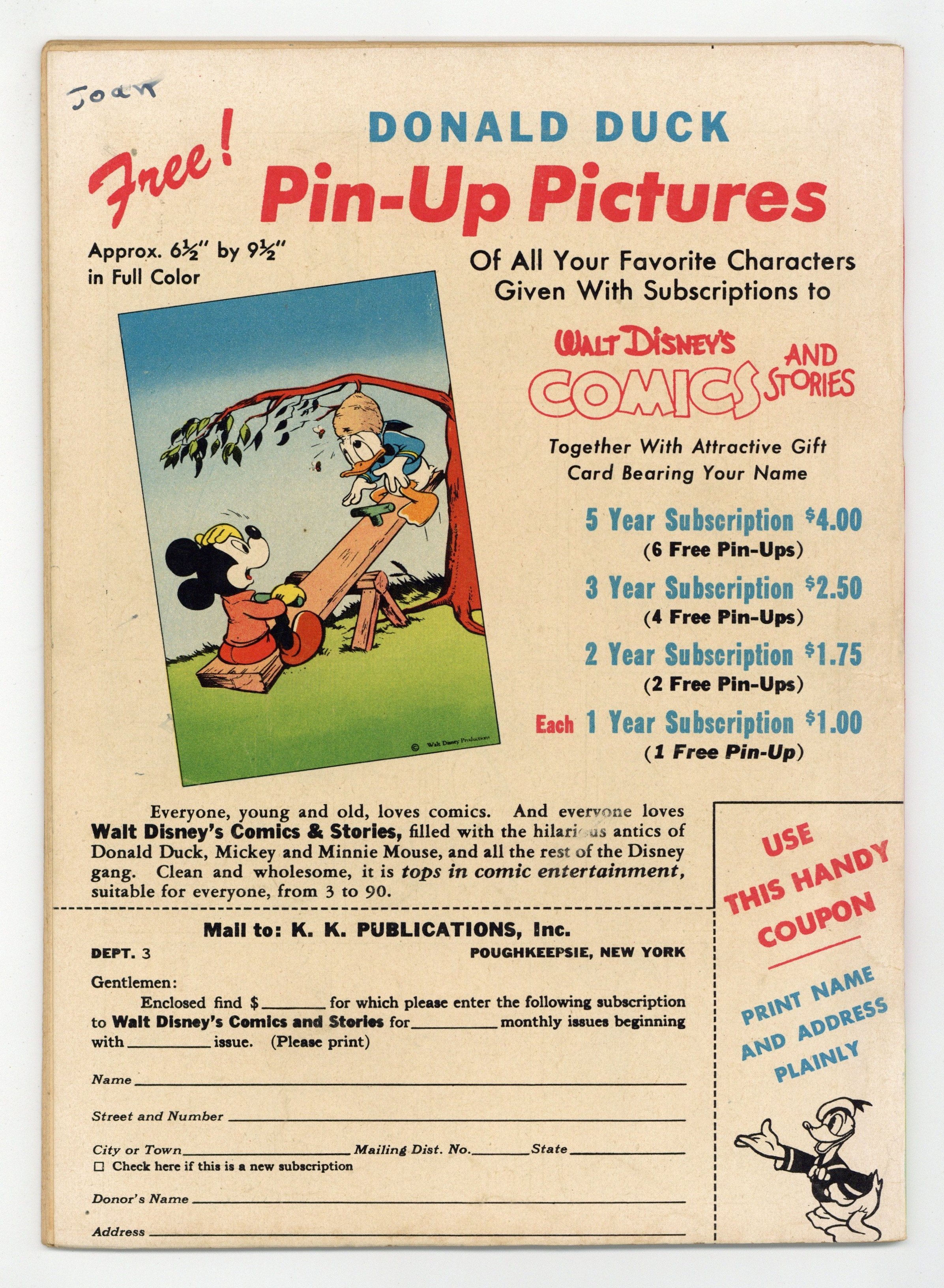 Cover by Walt Kelly. Stories and art by Carl Barks, Floyd Gottfredson, Merrill De Maris, Dick Moores, Bob Karp, Dick Shaw, Ralph Heimdahl, Don Gunn, George Waiss, Bill Wright, Sylvia Holland, and Al Taliaferro. Sometimes listed as Vol. 8 #6. The long-running vehicle for Disney character comics featured work by Carl Barks, Floyd Gottfredson, and Pogo's Walt Kelly. In a classic story from the Mickey Mouse comic strip, Goofy acquires a pet lion named Agnes. In a story by Barks, Donald competes with his nephews when they get jobs as telegram messengers. Bucky Bug battles a squirrel. Donald Duck; Bucky Bug; Li'l Bad Wolf; Mickey Mouse; Have a Heart; Daddy Duck; Pluto: The Bone Bandit; Mickey Mouse: Goofy and Agnes. 48 pages, Full Color. Cover price $0.10.