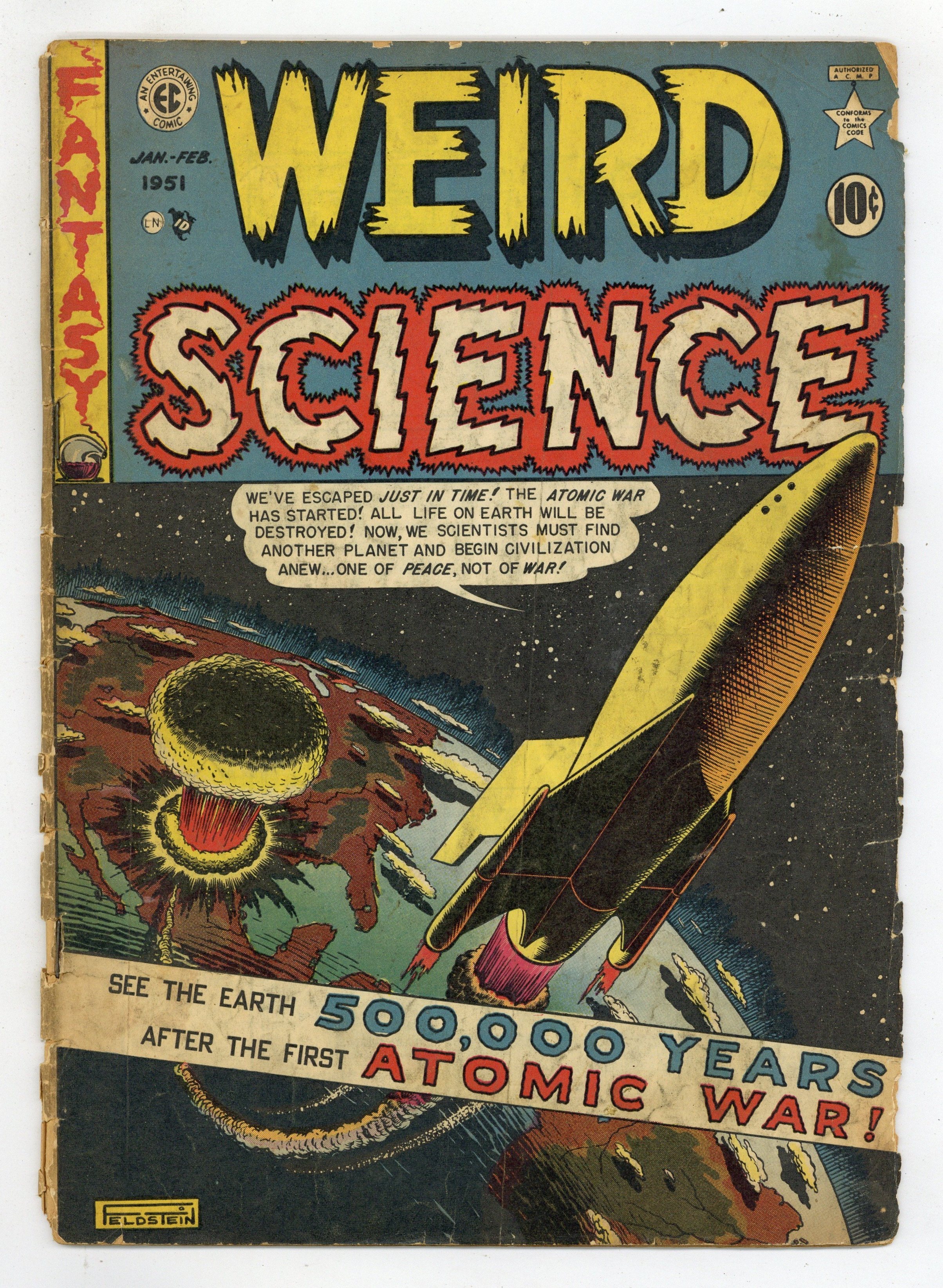 Cover by Al Feldstein. Stories by Harvey Kurtzman, Bill Gaines and Al Feldstein. Art by Harvey Kurtzman, Jack Kamen, Wally Wood, and Al Feldstein. EC's influential New Trend title featured some legendary sci-fi and comics artists. Scientists wonder if a threat from another world would unite humanity's warring factions, then get the chance to find out, in a story by Harvey Kurtzman. Space travelers visit their war-ravaged homeworld to find nothing's changed, with art by Wally Wood. A time-travel murder mystery is so convoluted it needs its own explanatory diagram, which is included. Classic Al Feldstein atom bomb/space cover. Made of the Future!; Return; Progress; The Last War on Earth; The Man Who Was Killed in Time. 36 pages, Full Color. Cover price $0.10.