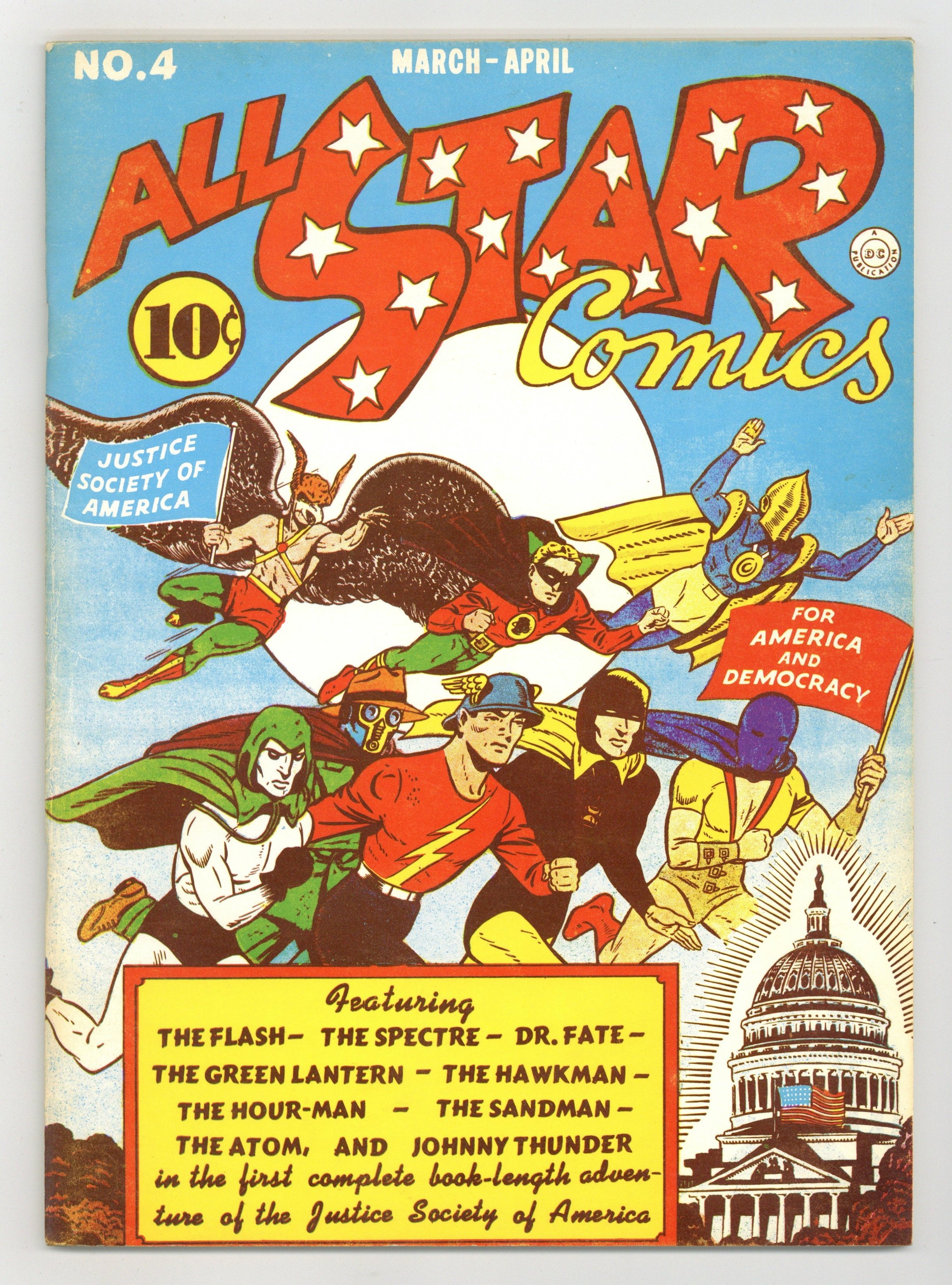 The sixth issue of the Flashback reprint series presents ALL STAR #4 originally published in 1941. Cover art by Everett E. Hibbard. "For America and Democracy!", script by Gardner F. Fox, art by Everett E. Hibbard (pages 1-10, 55-58), Martin Nodell (pages 11-17), Bernard Baily (pages 18-30), Howard Sherman (pages 31-36), Craig Flessel (pages 37-42), Sheldon Moldoff (pages 43-49), and Ben Flinton (pages 50-54); The JSA closes in on Fritz Klaver, who threatens to blow up everyone rather than be captured; But the JSA overpowers the Grey Shirts while Dr. Fate's occult powers halt Klaver in his tracks; Later, the JSA reports to the FBI Chief that their assignments have been successfully completed. "A Fortune Teller's Fortune" text story starring Johnny Thunder, art by Sheldon Meyer. Ad for The Flash. 68-pages, full color cardstock covers, 7-3/4-in. x 10-3/8-in. black-and-white interior on white paper stock, saddle-stitched binding. Cover price $3.00.