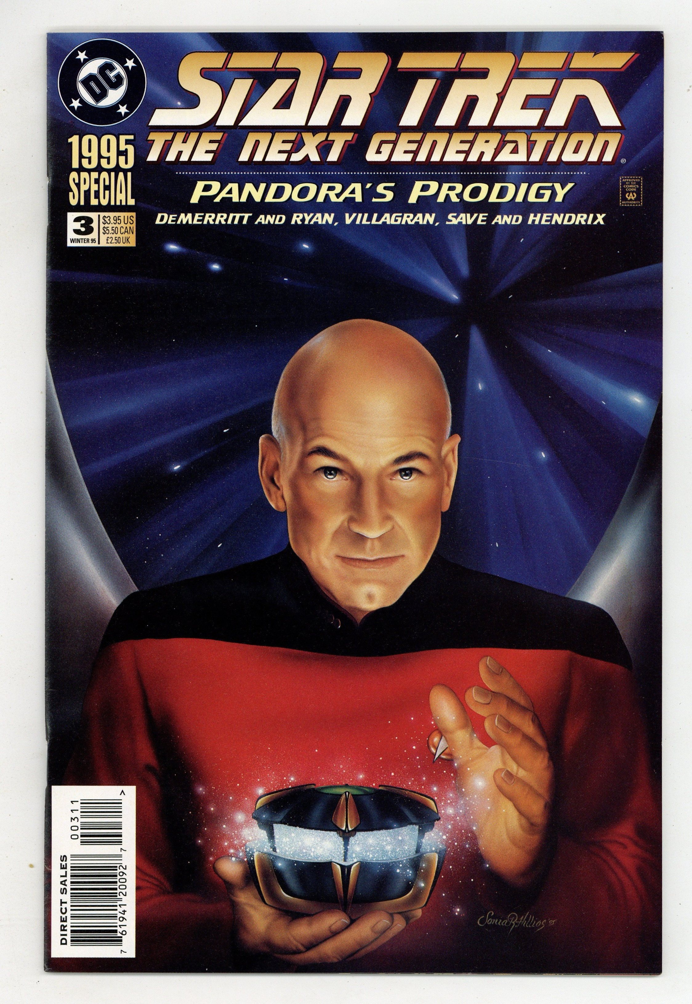 In "Pandora's Prodigy," terrorists board the U.S.S. Enterprise, determined to stop Picard from arbitrating a trade war between two alien races. Based upon an unused outline for Star Trek: The Next Generation. Written by Michael DeMeritt, with art by Ricardo Villagran. Plus, Captain Montgomery Scott is threatened by one of his old enemies, Klingon Captain Koloth, whose ship Scotty once infested with tribbles. Written by Kevin J. Ryan, with art by Ken Save and Shephard Hendrix. Painted cover by Sonia Hillios. 68 pages. Fracote Format. Cover price $3.95.
