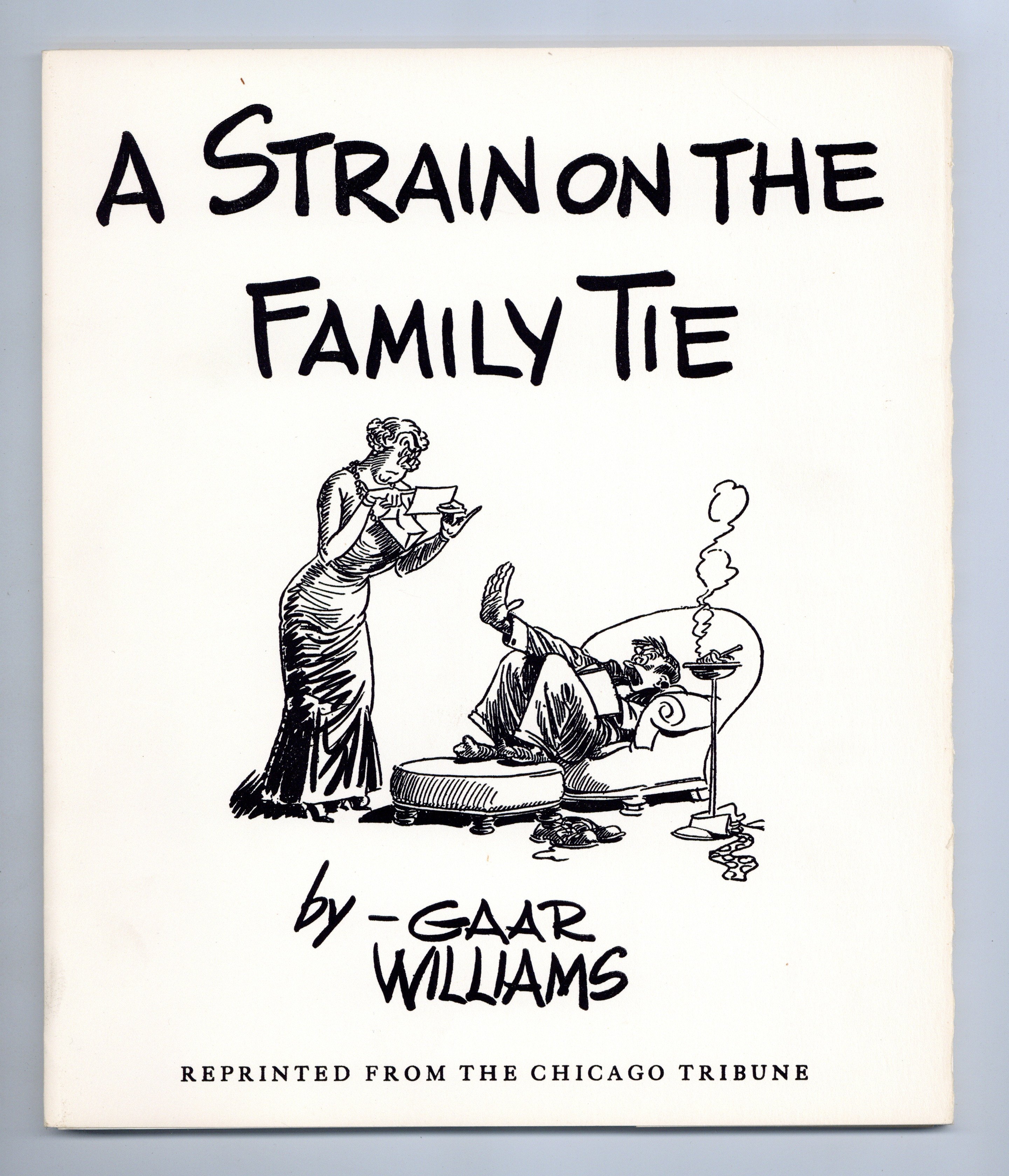 Published 1935 (est.) by Chicago Tribune.$43.00Set 01 - "A Strain on the Family Tie!" Portfolio by Gaar Williams. Gaar Williams, whose life in the Midwestern small town of Richmond in the 1890's gave inspiration to his popular work, served as a staff artist for the Chicago Daily News and the Indianapolis News before settling in Chicago permanently to work for the Chicago Tribune until his death in 1935. Gaar Williams's cartoons could be seen in thirty-nine newspapers around the country. These prints are reproductions of cartoons that originally appeared in the Chicago Tribune newspaper from 1927-1934. SET-01 includes 25 prints, B&W, held in a wrap-around slip folder, 8.25-in. x 10.25-in.