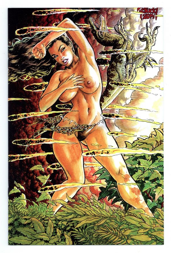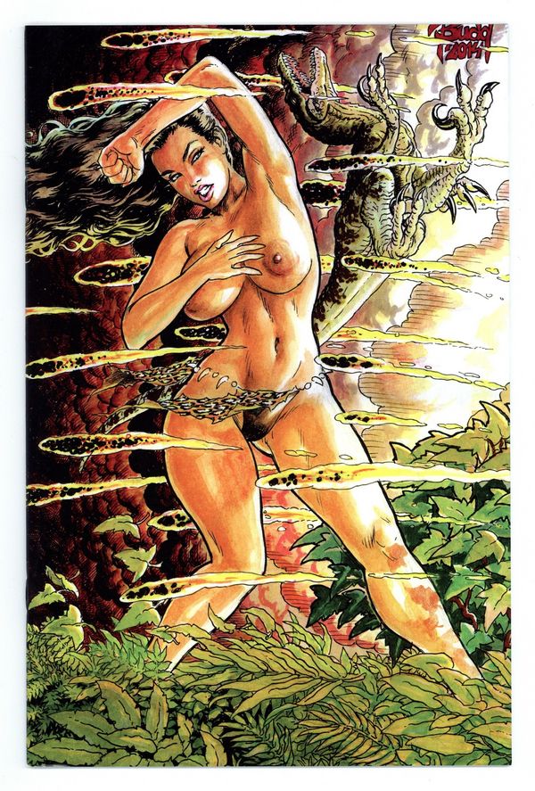 Budd Root Special Edition Cover E by Budd Root - Limited to 600 copies, with Certificate of Authenticity. Story and Art by Rob Durham. Following the direction of the fallen star from the conclusion of Cavewoman: Journey #2, Meriem and Klyde discover that the meteor isn't what they thought it was. Back in town, the merciless gang leader Blackstone has Professor Cook marked for death by a former marine, now mercenary, called 'Tripwire.' Unaware of this, the Prof. and Corporal Mack continue their search to find Meriem, hoping to bring her home and back to Bruce whom she believes is still dead. 24 pages, B&W. Cover price $3.99.