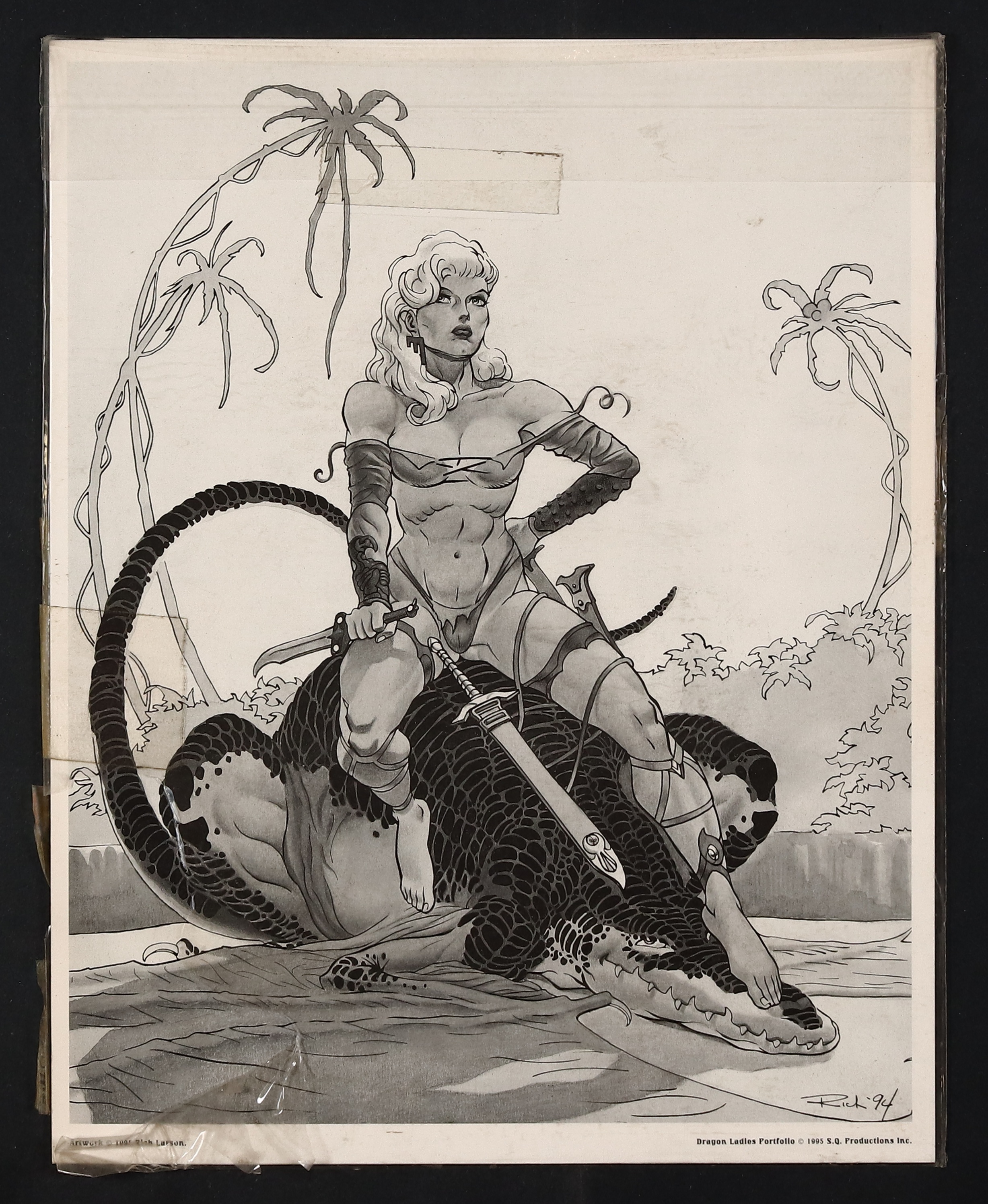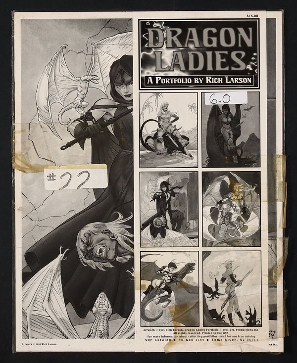 Tags: Art Portfolio$6.00Dragon Ladies is a 6-piece portfolio by Rich Larson. Known for his work in the field of Pulp Adventure, Larson captures the beauty and grace of fierce warrior-women of myth and legend. This set includes 6 beautifully inked 11 x 14 pieces depicting visions of epic adventure and otherworldly creatures. Black and white. Cover price $15.00.