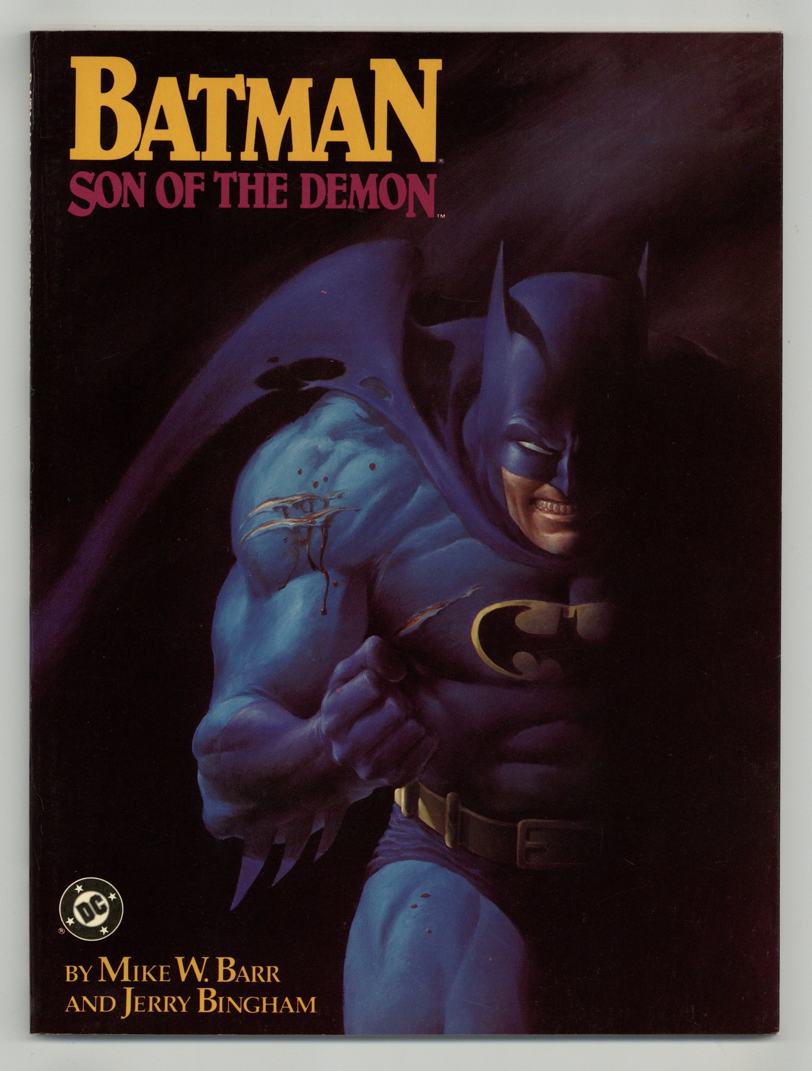 1st Printing. "Batman: Son of the Demon" Story by Mike W. Barr. Art by Jerry Bingham. Son of the Demon was one of DC Comics original Elseworld style stories. Batman must team-up with his arch nemesis Ra's Al Ghul to stop a madman from destroying the world. A romance between the Dark Knight and Ra's daughter, Talia, ignites and she conceives a son. This child would later grow up to appear in the critically acclaimed Kingdome Come series by Mark Waid and Alex Ross. Softcover, 78 pages, 8 1/2-in. x 11-in., full color. Cover price $8.95.