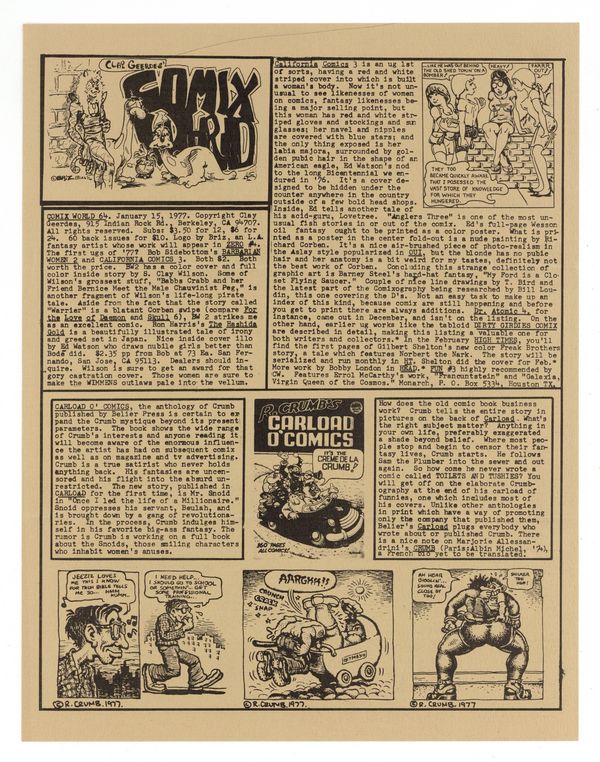 Tags: UndergroundPublished Jan 1977 by Clay Geerdes.$22.00January 15, 1977. Newsletter by Clay Geerdes. Contains news of comix, artists of interest, and a general review of what was happening in the underground market. Robert Crumb art. 8 1/2-in. x 11-in., 2 pages, black and white.