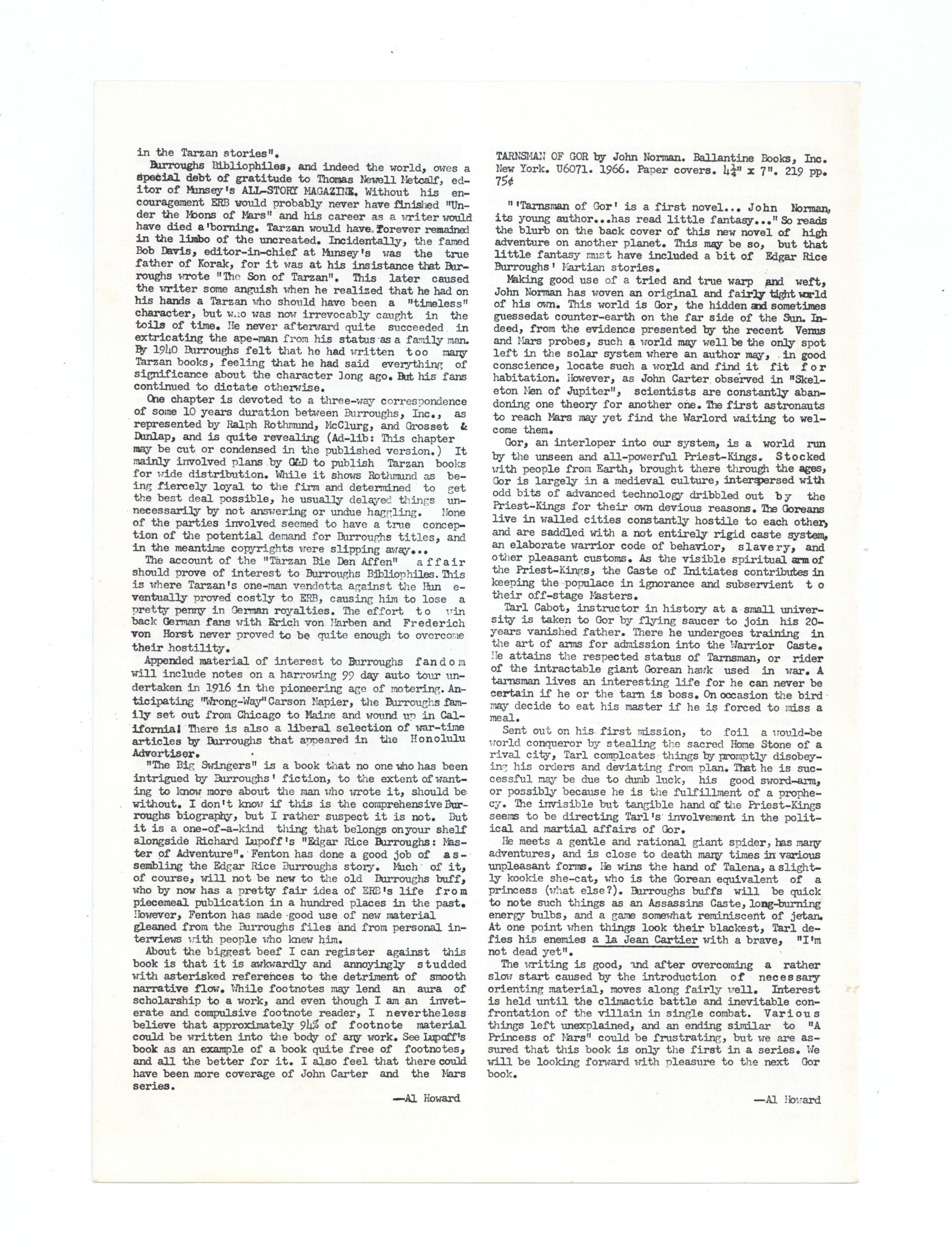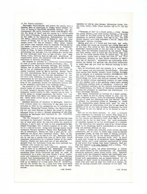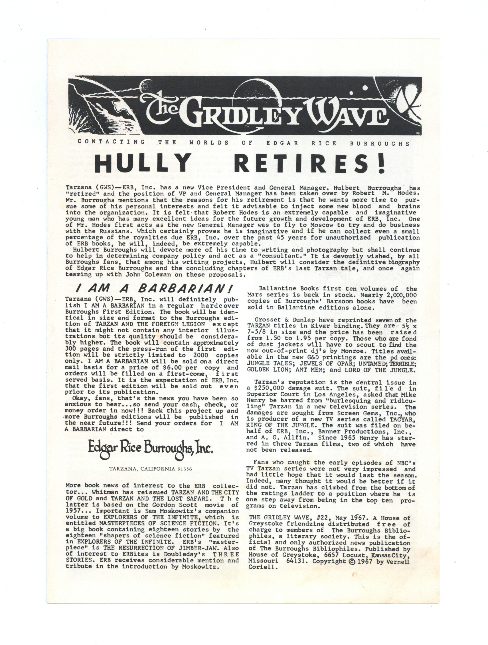Published May 1967 by Edgar Rice Burroughs, Inc.$18.00Tarzan newsletter by Vernell Coriell. Book reviews of Treasure of the Black Falcon and The Big Swingers. 7-in. x 10-in., 4 Pages. B&W.