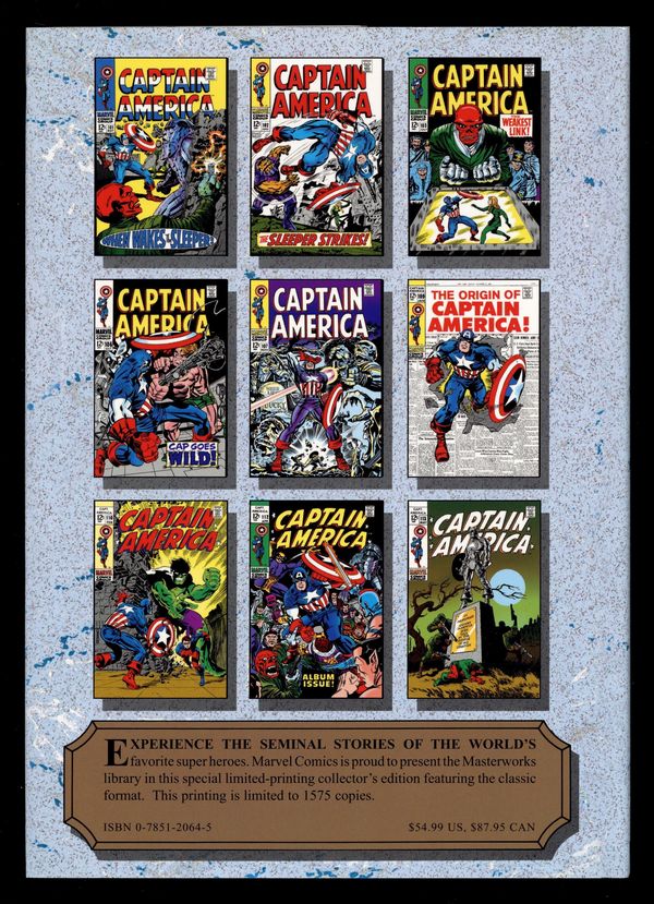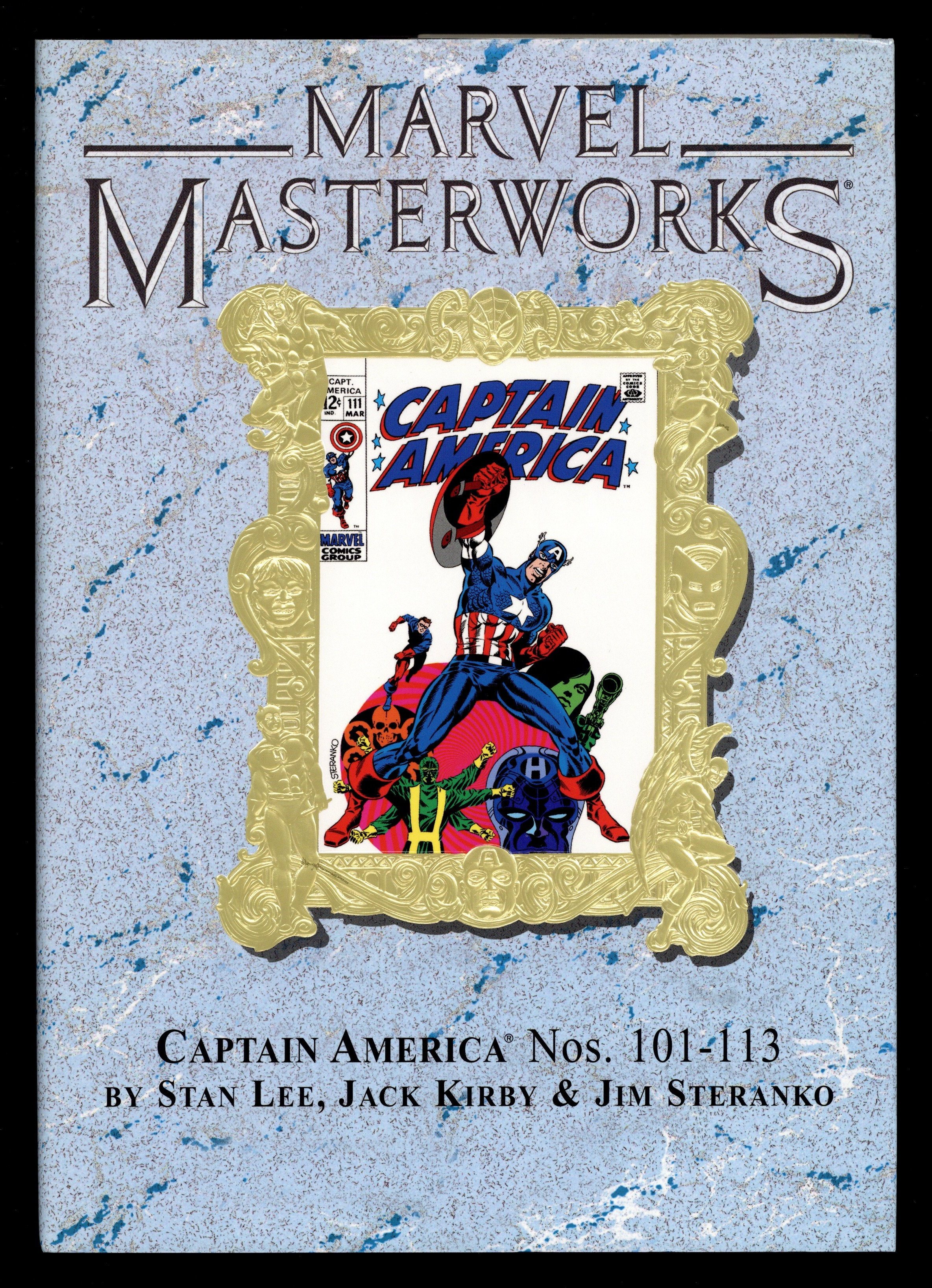 Volume 64 - 1st printing. "CAPTAIN AMERICA" Collects Captain America (1968-1996 1st Series) #101-113. Written by STAN LEE. Art by JACK KIRBY & JIM STERANKO. Cover by JIM STERANKO. Introduction by John Morrow. Mighty Marvel is unfurling a new Masterworks crafted by an incomparable trio of talents-Stan Lee, Jack Kirby and Jim Steranko! It's the best of '60s Marvel dynamism and design in one Captain America-packed volume! It's all set off by four-issue rumble with the Red Skull! When the Nazi ne'er-do-well attachs an H-Bomb fuse to Cap, he has no choice but to serve the Skull or America will suffer nuclear annihilation! Even a healthy thumping on Batroc the Leaper and the Trapster, can't cure the Man Out of Time's woes over his lost companion, Bucky. Relive Cap's amazing origin and learn how he met Bucky Barnes. If all that calamity from 'The King' Kirby wasn't enough, strap on your psychedelic crash helmet for a course in Steranko! The master of the medium will take you on a ride like none other with Cap vs. the Hulk, the return of Bucky, and the death of Captain America in a battle with Hydra. We don't need to say it, but we can't help ourselves-'Nuff Said! Hardcover, full color. Cover price $54.99.