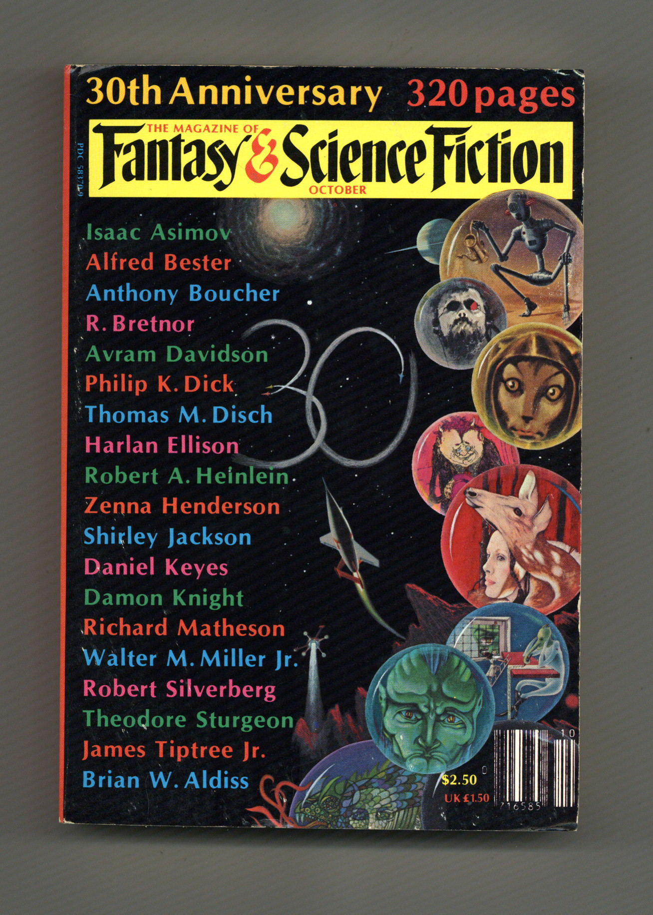 Published Oct 1979 by Mercury Publications.$4.00Volume 57, Issue 4 - October 1979. 30th Anniversary Issue. Cover by Tom Bevans. Fantasy and science fiction stories by Isaac Awsimov, Alfred Bester, Anthony Boucher, R. Bretnor, Avram Davidson, Philip K. Dick, Thomas M. Disch, Harlan Ellison, Robert A. Heinlein, Zenna Henderson, Shirley Jackson, Daniel Keyes, Damon Knight, Richard Matheson, Walter M. Miller Jr., Robert Silverburg, Theodore Sturgeon, Jame Tiptree Jr, and Brian W. Aldiss. 5 1/2-in. x 7 1/2-in., 162 pages, B&W Cover price $1.25.