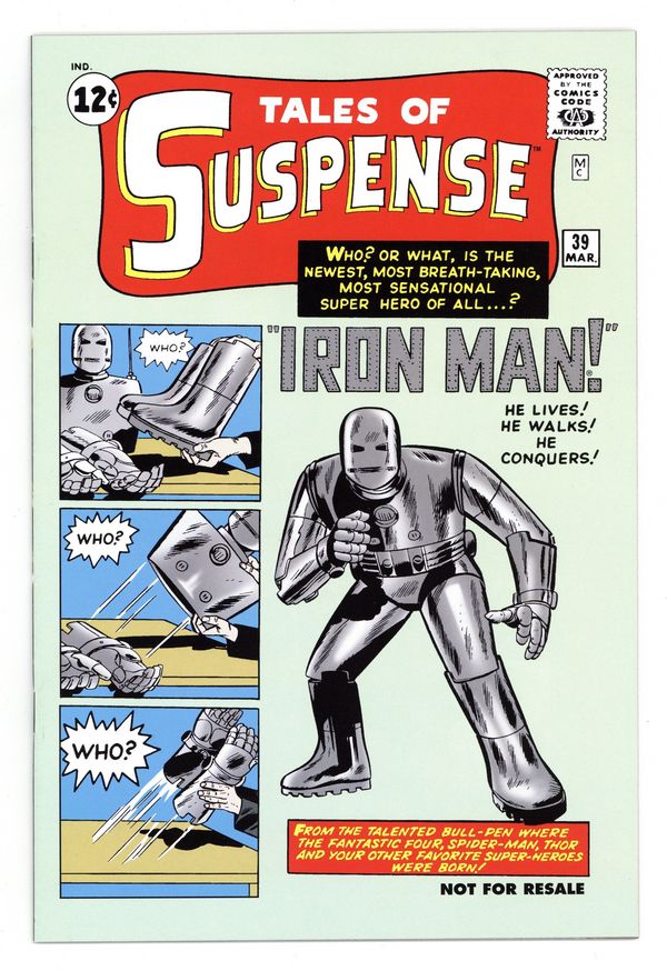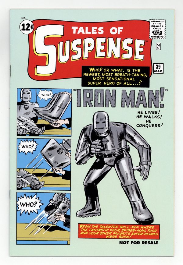 Reprint edition that originally came packaged with First Appearance Iron Man from Marvel Legends series 14 (Mojo Series). First appearance of Iron Man in "Iron Man is Born!" Plot by Stan Lee, script by Larry Lieber, layouts by Jack Kirby, pencils and inks by Don Heck. Back-up stories: "The Last Rocket" with Gene Colan art; "Gundar" with script by Stan Lee, art by Steve Ditko; and a text story, "The Treasure." Kirby/Heck cover. Cover price $0.12.