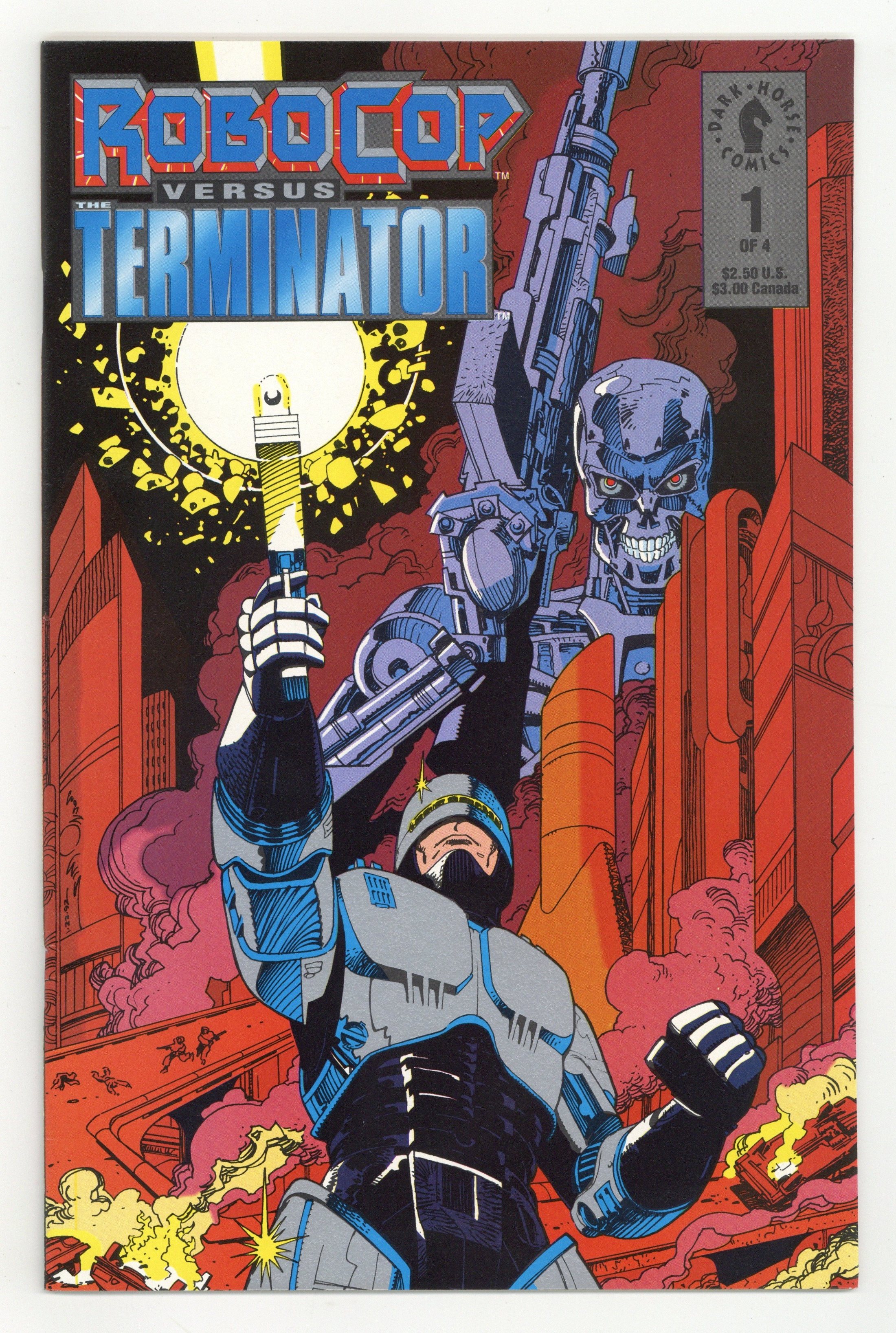Published 1992 by Dark Horse.$18.00Writer: Frank Miller. Artist: Walter Simonson. Cover Artist: Walter Simonson. Letterer: John Workman. Colorist: Rachelle Menashe. Genre: Science-Fiction, Action/Adventure. In the machine-dominated future of 2029, a human rebel gains access to the Skynet computer's Time Displacement Equipment and sends herself into the past on a desperate mission to kill officer Alex Murphy, a.k.a. RoboCop. But Skynet is onto her plan and dispatches a trio of Terminators to the past as well. The Terminators' mission: protect RoboCop at all costs. Just what the heck is going on here? Cover price $2.50.