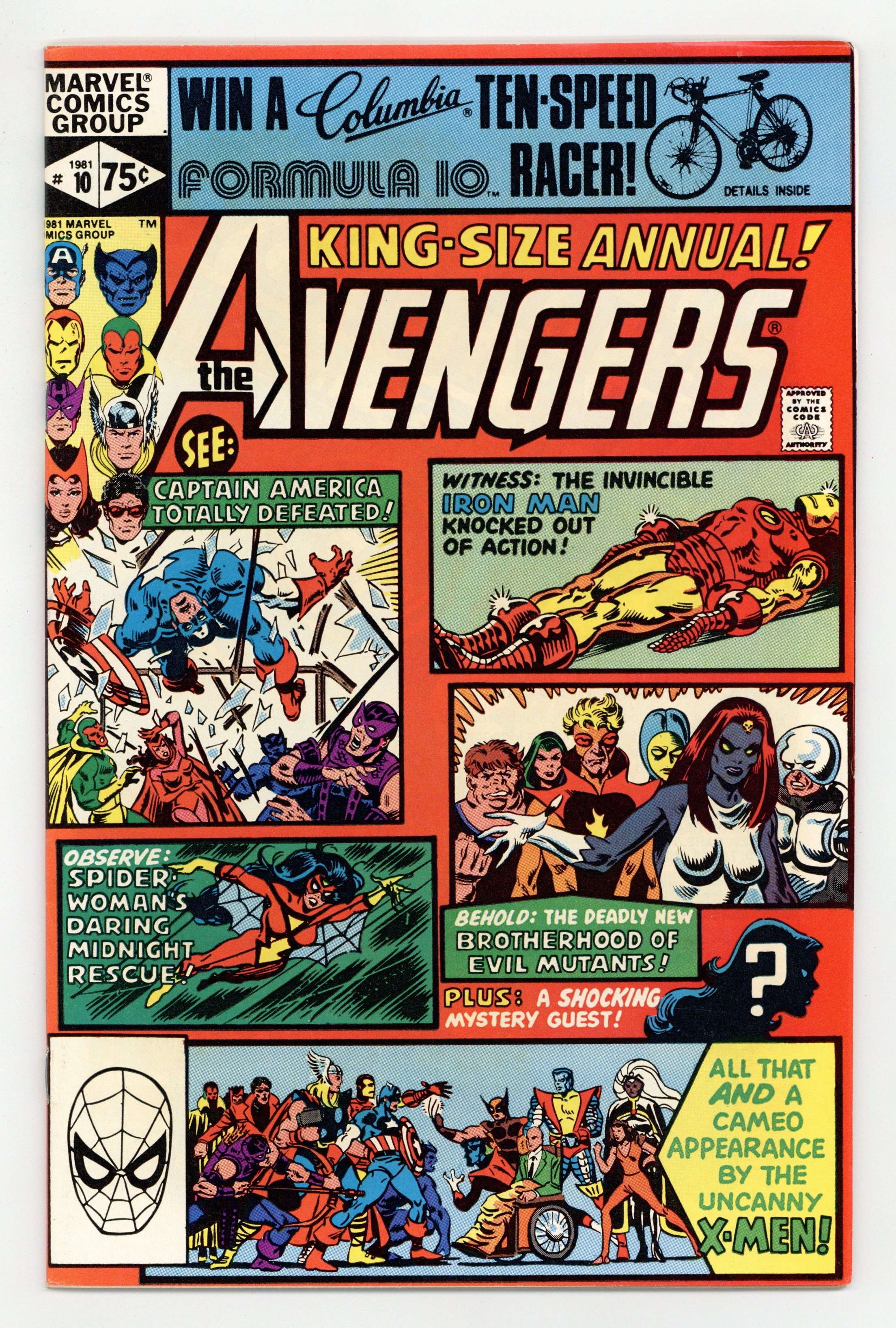 Ends Jan 26 7:34 PM CST Bid History 7 bids Current Bid $46 Your Secret Max Bid If you'd like to bid, please log in or register. Direct Edition. First appearance of Rogue and Madelyne Pryor in "By My Friends Betrayed!" Spider-Woman, X-Men, Carol Danvers, and New Brotherhood of Mutants guest star. Script by Chris Claremont. Pencils by Michael Golden. Inks by Armando Gil. Cover by Al Milgrom. This action-packed annual has got it all, true believers: the first appearance of Rogue, the spectacular art of Michael Golden, the tragic return of Carol Danvers, and the stupendous struggle between the Brotherhood of Evil Mutants and the mighty Avengers! Following the events of Uncanny X-Men #142, Mystique & her New Brotherhood of Evil Mutants attempt to break four of their members out of Ryker's Island prison! After Rogue and Mystique take down Captain America, Iron Man, and Thor, the rest of the Avengers and Spider-Woman catch up to the villains, and the epic clash erupts! Woven in and around the frantic action at Ryker's Island is the heartbreaking story of Carol Danvers' return to Earth. Her life has fallen apart since leaving for Limbo with Marcus Immortus in Avengers #200, and now, stripped of her powers and memories, Carol begins the long road to recovery. And the first step is an emotional confrontation with her former teammates! Notes: Marvel Super-Heroes #11 (Fall 1992) fills in the details of Carol Danvers' life between Avengers #200 and Avengers Annual #10. The Thing stars in a one-page Hostess ad, "A Lesson to Be Learned!" This issue was reprinted in 1993 in the trade paperback: The Greatest Battles of the Avengers. 52 pages, full color. Cover price $0.75.