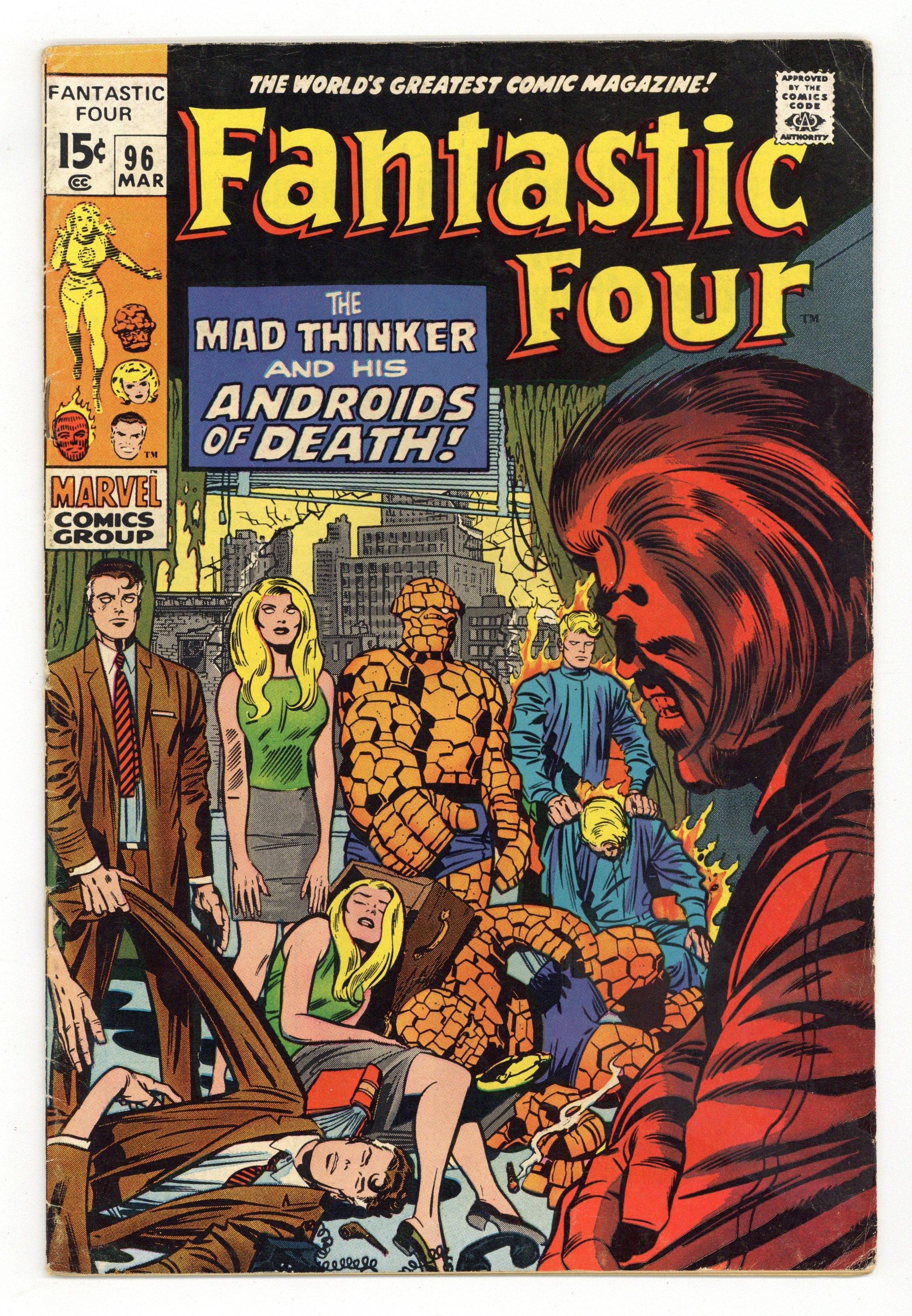 "The Mad Thinker and His Androids of Death!" Script by Stan Lee. Pencils by Jack Kirby. Inks by Frank Giacoia. Cover by Jack Kirby, Joe Sinnott, and Marie Severin (backgrounds). A quiet afternoon at the Baxter Building is interrupted by a surprise attack against Ben Grimm…by the Human Torch! Oh my, why has Johnny Storm ambushed his long-time friend? But hold on, is that really the FF's youngest member or a well-constructed android look-a-like? Using his trademark exact calculations, the Mad Thinker sends his replica androids to capture the Fantastic Four! And with textbook precision the thinker's sinister plan rolls towards completion! However, the FF's familiar foe may have once again miscalculated the human element! Giving Mister Fantastic an opportunity to outthink the thinker! (Note: The Mad Thinker returns in Fantastic Four 100.) 36 pages Cover price $0.15.