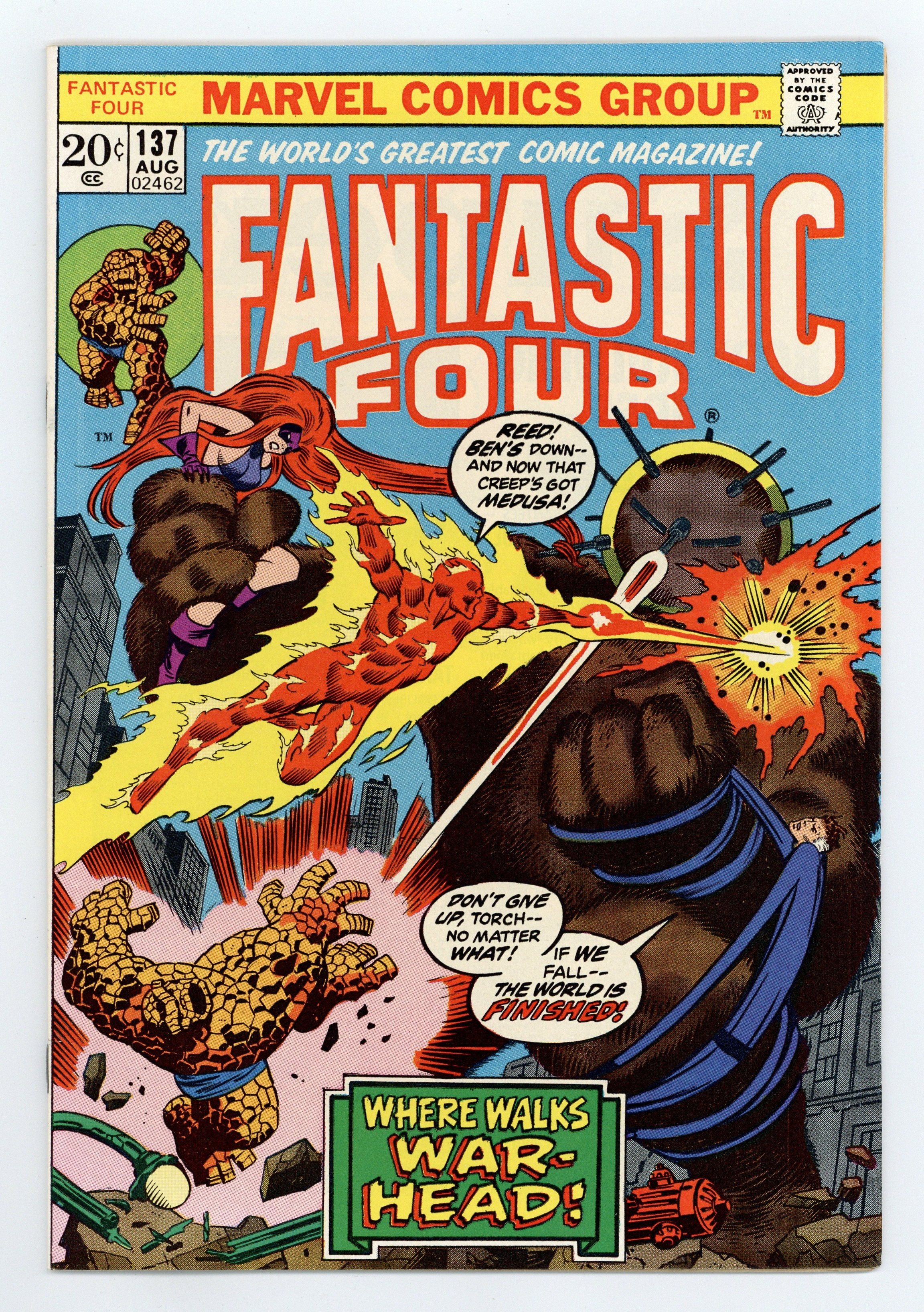 Tags: Fantastic Four$17.25"Rumble on Planet 3" Part 2 of 2. Plot by Roy Thomas. Script by Gerry Conway. Art by John Buscema (breakdowns) and Joe Sinnott (finishes). Cover by John Buscema and Joe Sinnott. The FF's adventure into a time-warped 1950's America continues...as Mr. Fantastic and the Thing invade a medieval castle looking for a man called the Brain (aka Slugger Johnson incognito)! Moments later, Medusa and the Human Torch join the fight too! After skirmishing with one another, the Fantastic Four finally face their main foe: Warhead! With help from the wild ones, the FF will try to disarm Warhead! Cameo appearance by Thomas Gideon. (Note: The Shaper of Worlds appears next in Incredible Hulk 190.) 36 pages Cover price $0.20.