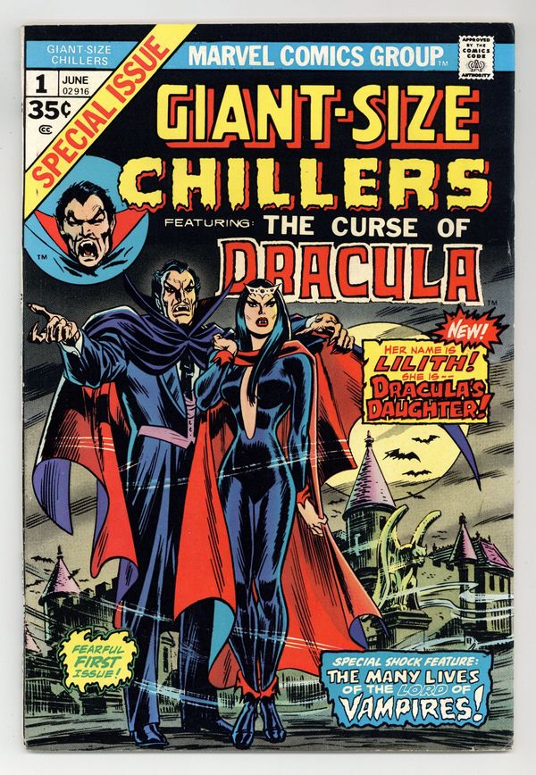 52-page giant. Origin and 1st appearance of Lilith (Dracula's daughter) in a new Dracula story, "Night of the She-Demon." Script by Marv Wolfman, pencils by Gene Colan, inks by Frank Chiaramonte. Two-page text history of Dracula in Marvel Comics by Wolfman. Reprints: "Have You Ever Seen a Huge, Black Vampire" (script by Stan Lee, art by John Romita Sr. from Mystic 25); "The Village Graveyard" (art by Russ Heath from Weird Worlds 4). Romita cover. Title becomes Giant-Size Dracula with # 2. Cover price $0.35.