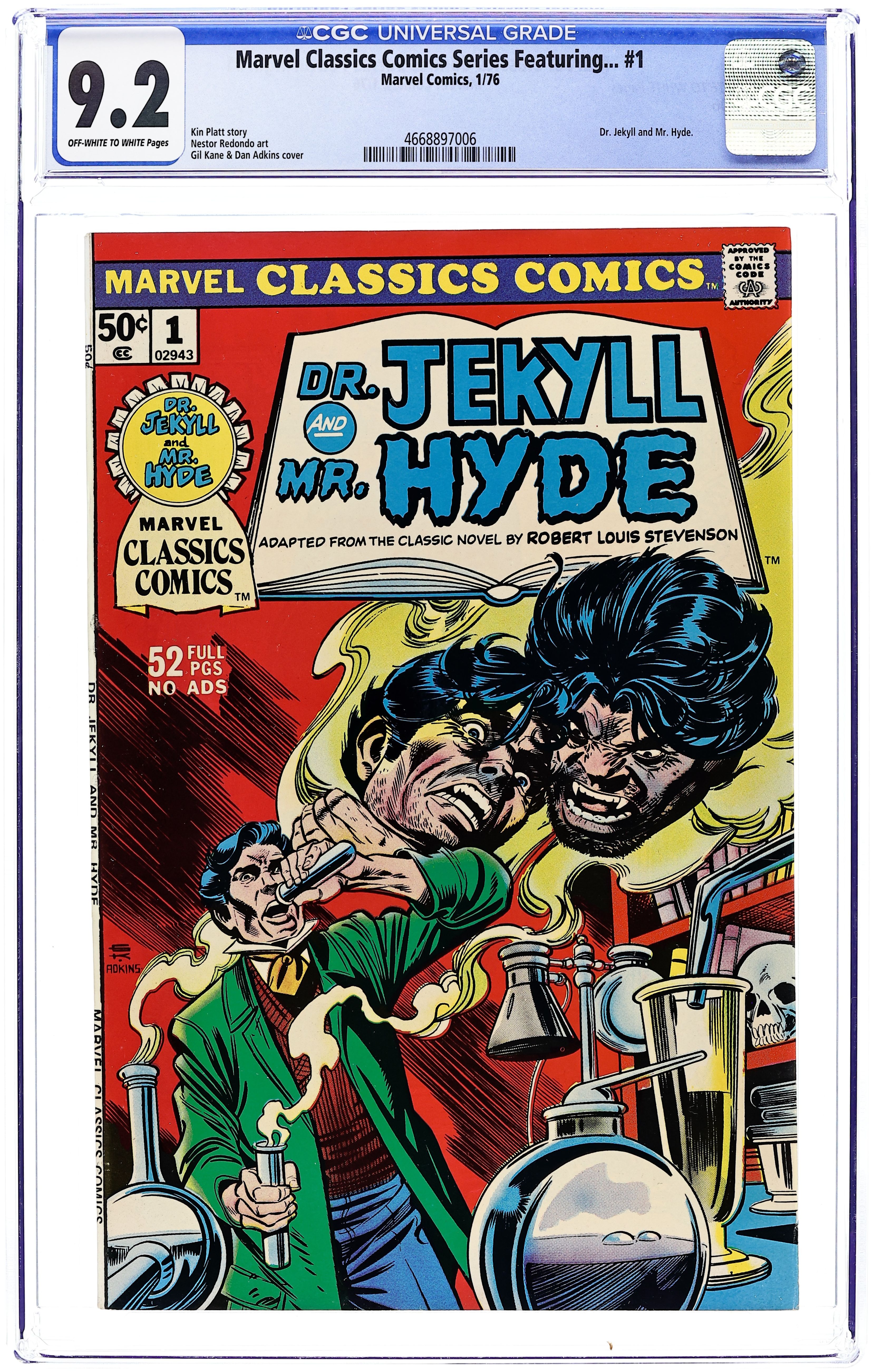 Cover pencils by Gil Kane, inks by Dan Adkins. "Dr. Jekyll and Mr. Hyde," script by Kin Platt (adaptation), art by Nestor Redondo: Dr. Jekyll gets in trouble when he lets his dark side run wild with a potion that transforms him into the animalistic and hedonistic Mr. Hyde. Adapted from the Robert Louis Stevenson novella "The Strange Case of Dr. Jekyll and Mr. Hyde" (1886). Short biography of Robert Louis Stevenson. 52 pgs., full color. $0.50. Cover price $0.50.