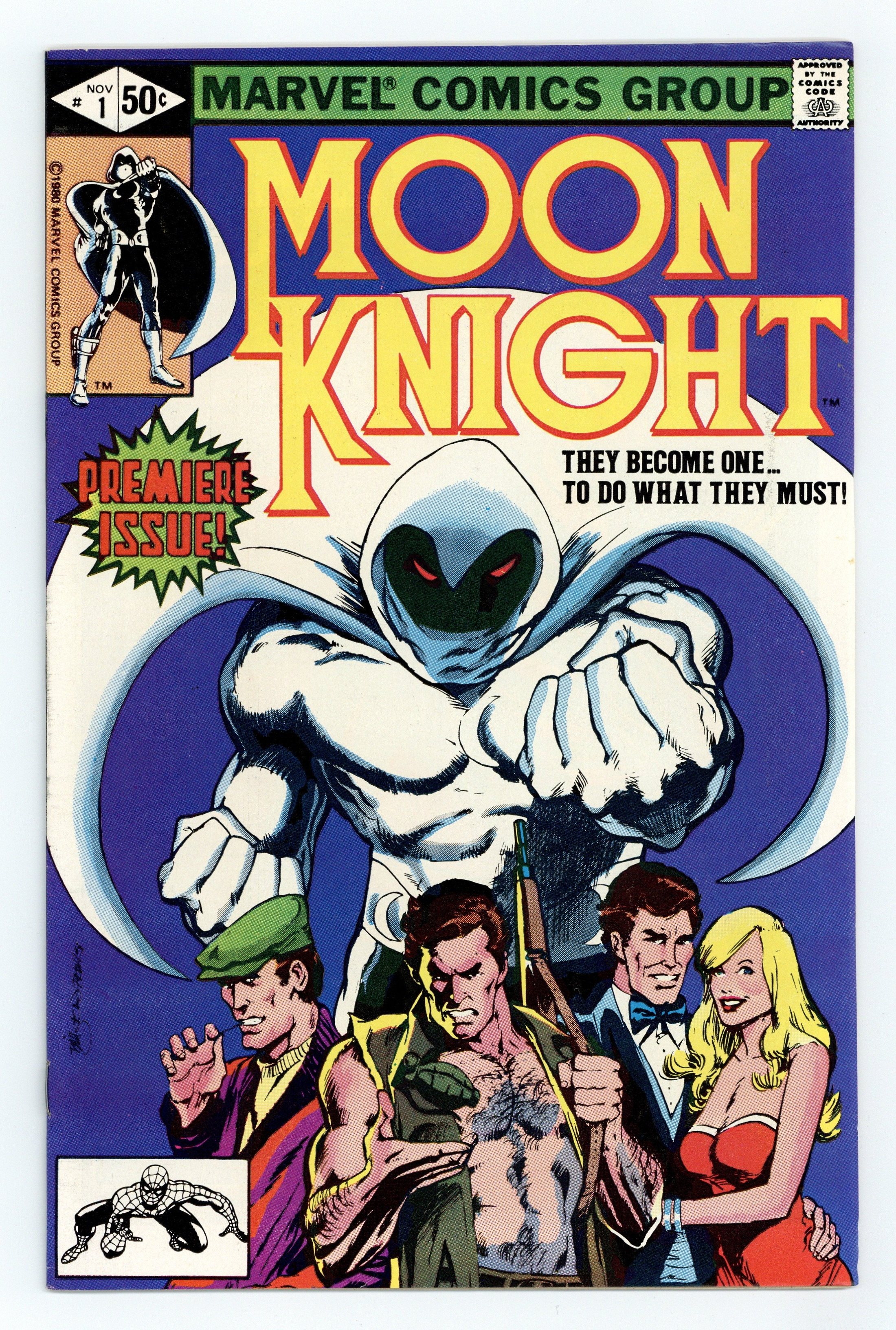 Starts Apr 27 Direct Edition. "The Macabre Moon Knight!" Written by Doug Moench. Art by Bill Sienkiewicz. Mercenary, Wall Street wizard, a street smart cabbie, masked-avenger - Marc Spector is all of these things and more. Nothing before could have possibly prepared you for the strange world of Moon Knight! 32 pages, FC. NOTE: 1st appearance of Bushman. Cover price $0.50.