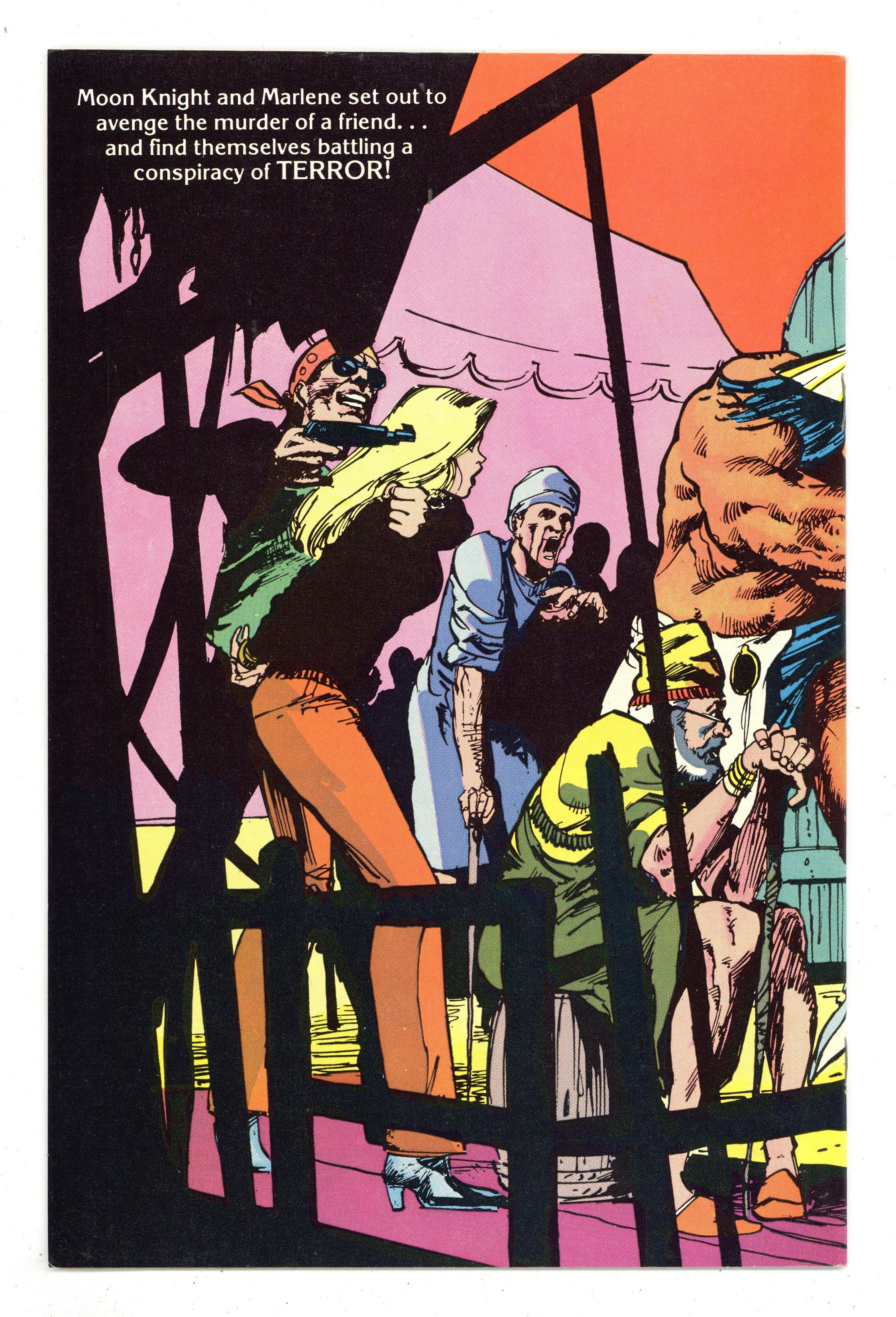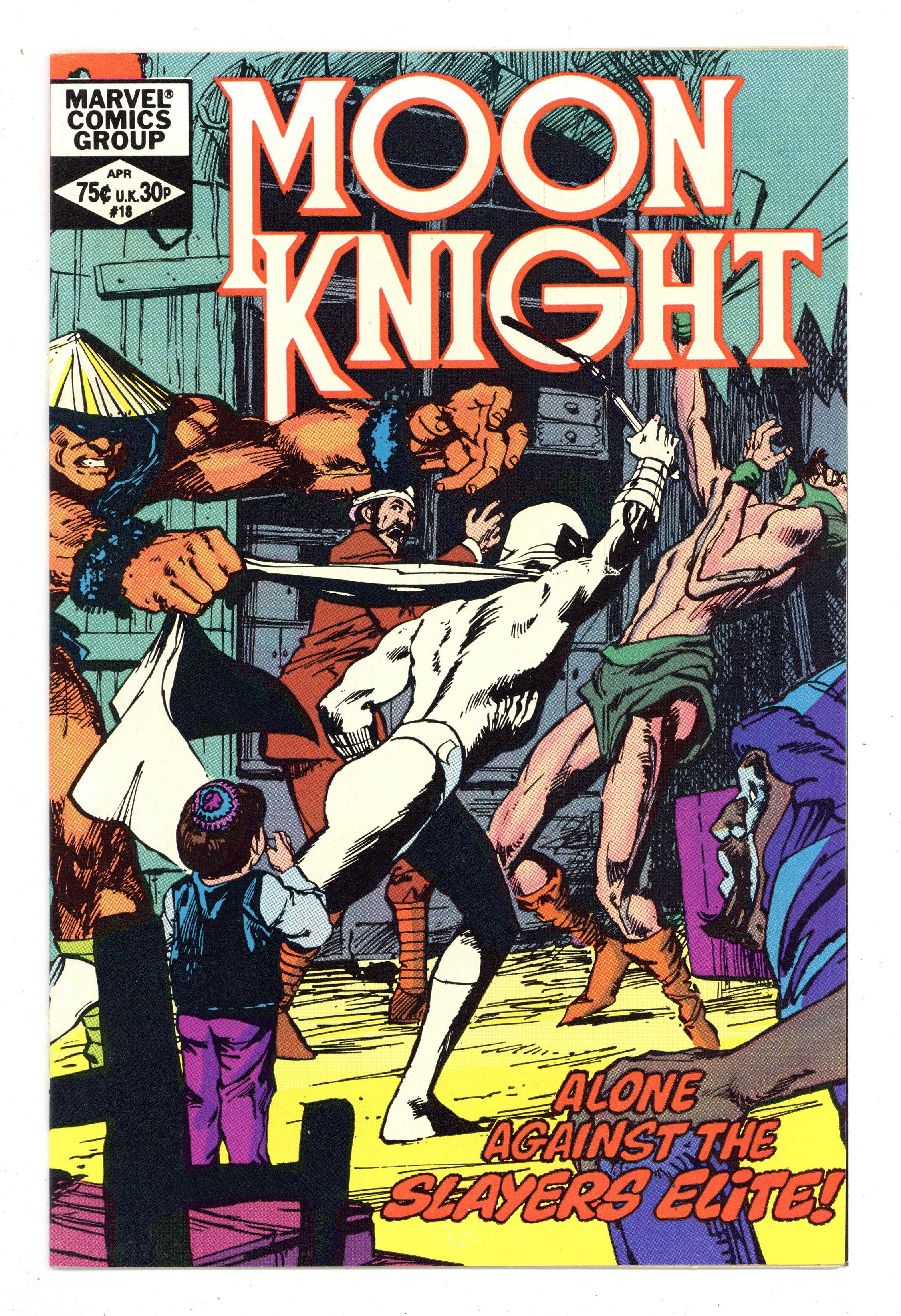 "The Slayer's Elite!" Written by Doug Moench, with art by Bill Sienkiewicz and Steve Mitchell. Cover by Bill Sienkiewicz. Moon Knight is in Jerusalem preparing to take on Nimrod Strange and his army of anarchists, but Nimrod gets the jump on him and sends a trio of deadly assassins to finish him off. 32 pages, FC. Cover price $0.75.
