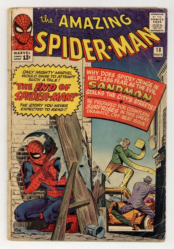 Ends Dec 8 7:14 PM CST Bid History 10 bids Current Bid $77 Your Secret Max Bid If you'd like to bid, please log in or register. Cover art by Steve Ditko. Third appearance of the Sandman in The End of Spider-Man!, script by Stan Lee, art by Steve Ditko; With the entire city thinking he is a coward, Spider-Man runs from Sandman; Peter's life is in shambles, and he contemplates giving up being Spider-Man to concentrate on his personal life; Cameos by the Avengers, Daredevil, the Fantastic Four, the Green Goblin, Kraven the Hunter, Doctor Octopus, and the Vulture. First appearance of Ned Leeds (later Hobgoblin). Reprinted in Marvel Tales # 13 and 156. Letter to the editor from comics artist Frank Brunner. 36 pgs. $0.12. Cover price $0.12.