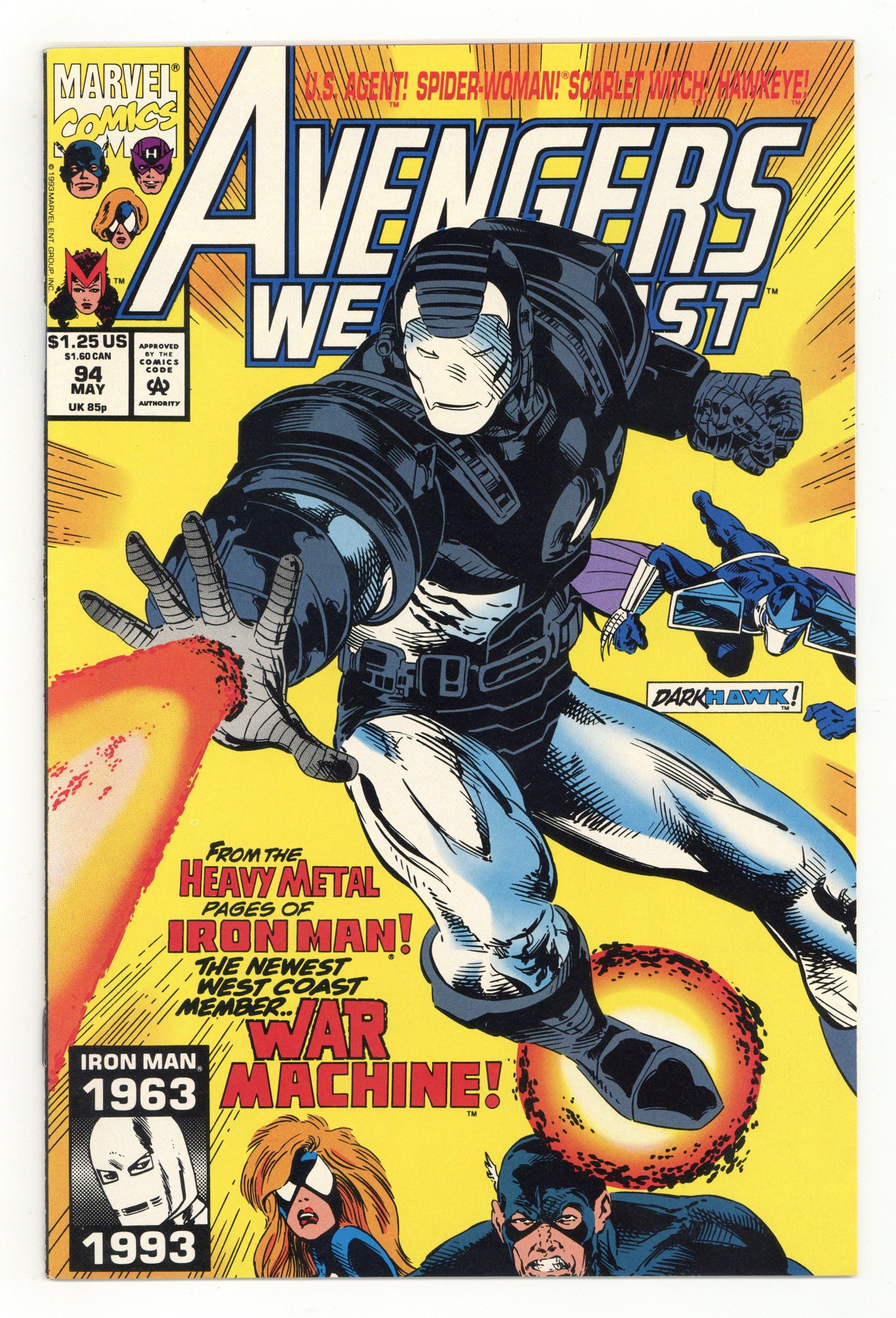 "Personal Demons" Pax Demonica Part 2 of 3. Guest-starring Darkhawk. Script by Roy Thomas and Dann Thomas. Pencils (and plot assist) by David Ross. Inks by Tom Dzon. Cover by David Ross and Tim Dzon. With the recent losses of Wonder Man and Iron Man, the west coast team is desperate to add firepower to their roster! So when Clint, Bobbi, and the agent visit Stark Enterprises; they find a powerful new member: War Machine! And now the Avengers are ready to fly to Demonica and tangle with the Pacific Overlords! However they have to be careful, because Dr. Demonicus just hijacked a commercial airliner and took all the passengers hostage! But once the Avengers' quinjet lands in Demonica, the full-scale war erupts! Six avengers and Darkhawk vs. Klaw, Morningstar, Cybertooth, Irezumi, Jawbreaker, Kain, and Kuroko! Cameo appearances by Tony Stark and Raksasa. (Note: Elements of the story cross over with Iron Man 291.) 32 pages. Cover price $1.25.