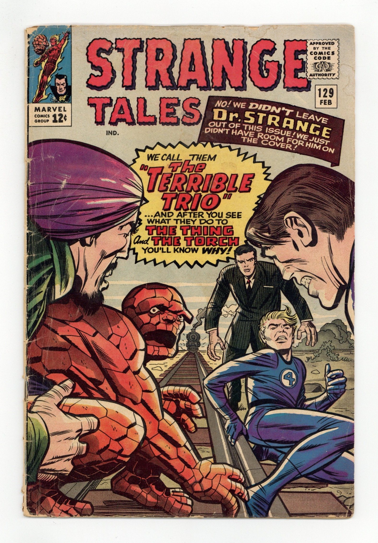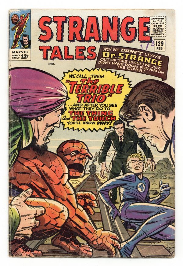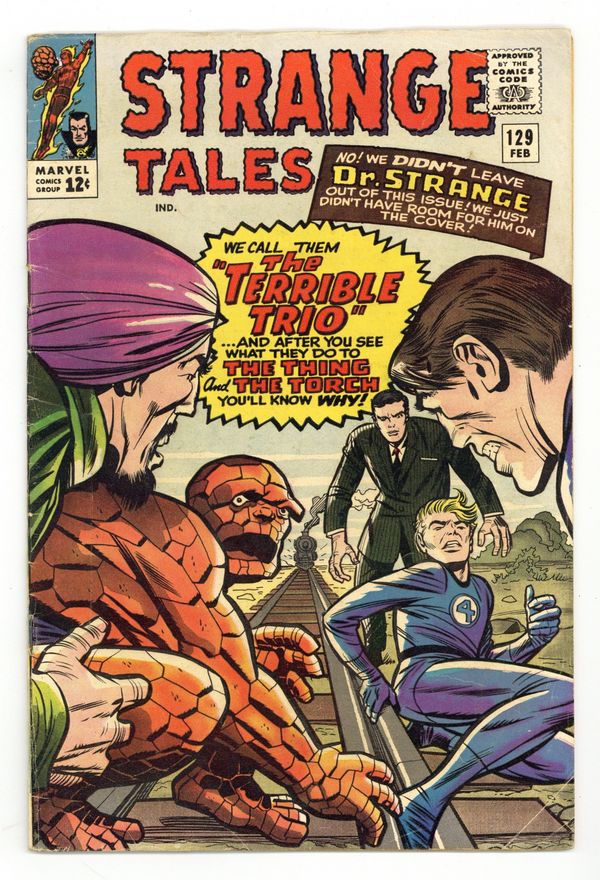 Cover pencils by Jack Kirby, inks by Chic Stone. The Human Torch and the Thing star in "The Terrible Trio!", script by Stan Lee and Dick Ayers (co-plot), pencils by Dick Ayers, inks by Frank Giacoia (as Frankie Ray); On the golf course, Doris nags Johnny by comparing him to "gentlemanly" Peter Parker; When the latest emergency arises, she says a girl like her should have her head examined; Johnny falls into a trap of The Terrible Trio, but manages to send out a distress signal to Ben, who takes on these losers and saves Johnny's life in a railway yard. "Beware...Tiboro! The Tyrant of the Sixth Dimension!", script by Steve Ditko (plot) and Don Rico (script), art by Steve Ditko; A panel of three scientists appear on a TV program, rejecting Dr. Strange as an authority on the supernatural and dismiss magic as superstition; When the lights go out the men vanish and Dr. Strange is summoned; He discerns that the idol they dismissed is a gateway to the dimension of Tiboro, a powerful entity set to attack Earth; Strange travels to Tiboro's land and a fierce battle commences. 36 pgs., full color. Cover price $0.12.