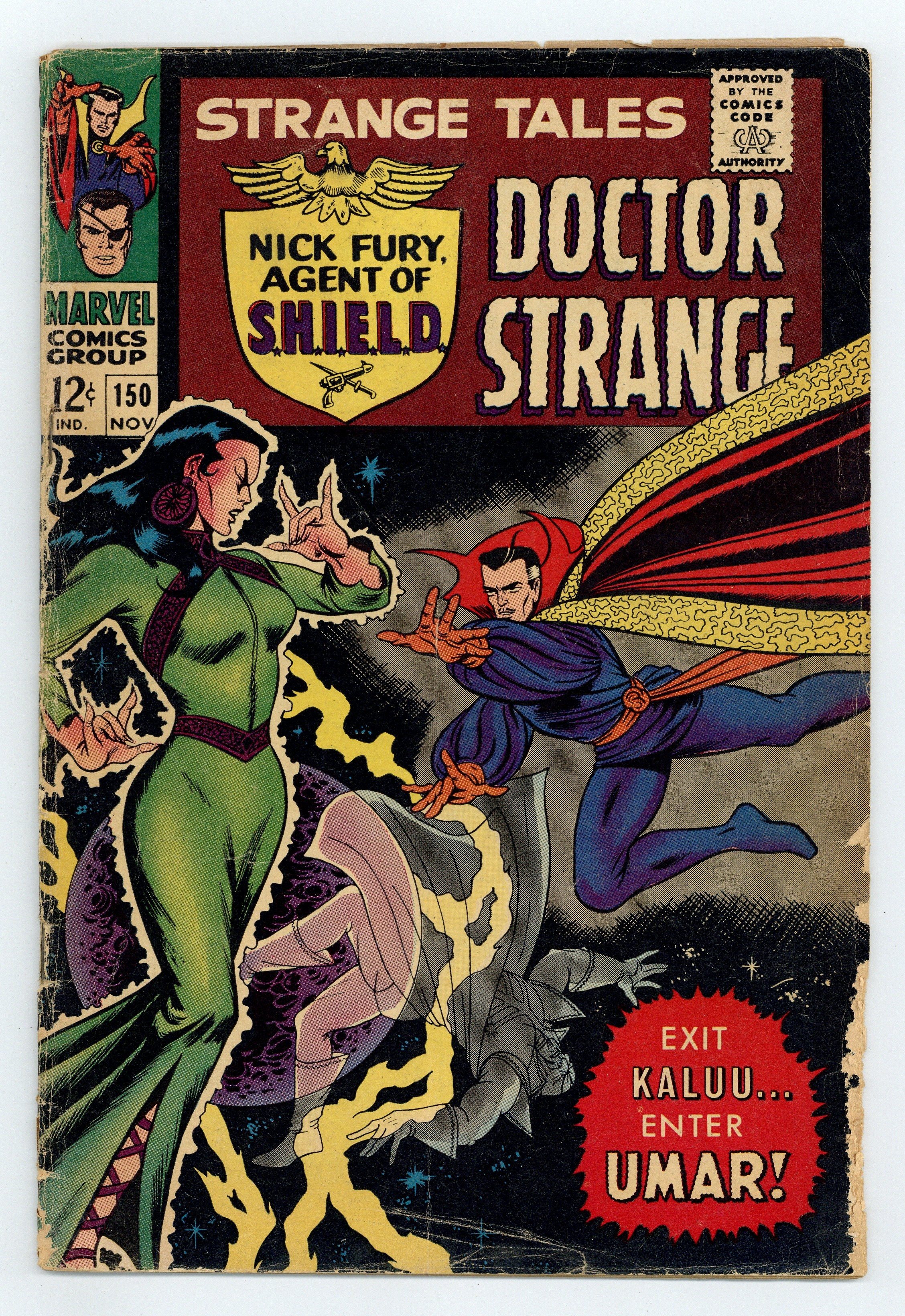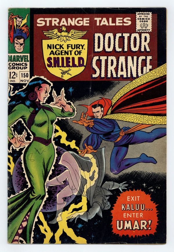 Tags: Marvel Legacy Numbering: Doctor Strange (part 150)$18.00Cover art by Bill Everett. Nick Fury stars in "Hydra Lives!", script by Stan Lee and Jack Kirby (co-plot), pencils by Jack Kirby (layouts) and John Buscema (his first work for Marvel), inks by Frank Giacoia; Fury subjects himself to a dangerous test in order to prove that an atomic missile can be detonated long-distance by a sonic weapon which SHIELD believes HYDRA has; While both he & Dugan are recovering from injuries, Don Cabellero, at the urging of an undercover SHIELD man, invites Fury to a party in ancient Karnopolis in the Sahara Desert; Caballero is a disguise for the new Supreme Hydra, who is aware a SHIELD agent has invaded his ranks. First appearance of Umar (the sister of Dormammu) in "The Conquest of Kaluu!", script by Roy Thomas and Bill Everett (co-plot), art by Bill Everett; Kaluu realizes Strange and the Ancient One have escaped to the past of ancient Babylonia where The Ancient One obtains The Book Of The Vishanti; Before Kaluu can extinguish the Flames of the Faltine, Strange returns to the present with the mystic book which hurls his spell back to him; The Ancient One sends Kaluu into Limbo for all time; In The Dark Dimension Clea fears the onslaught of the Mindless One's freed from their prison with Dormammu gone. Letter to the editor from Carl Gafford. Merry Marvel Marching Society info and coupon. 36 pgs., full color. Cover price $0.12.
